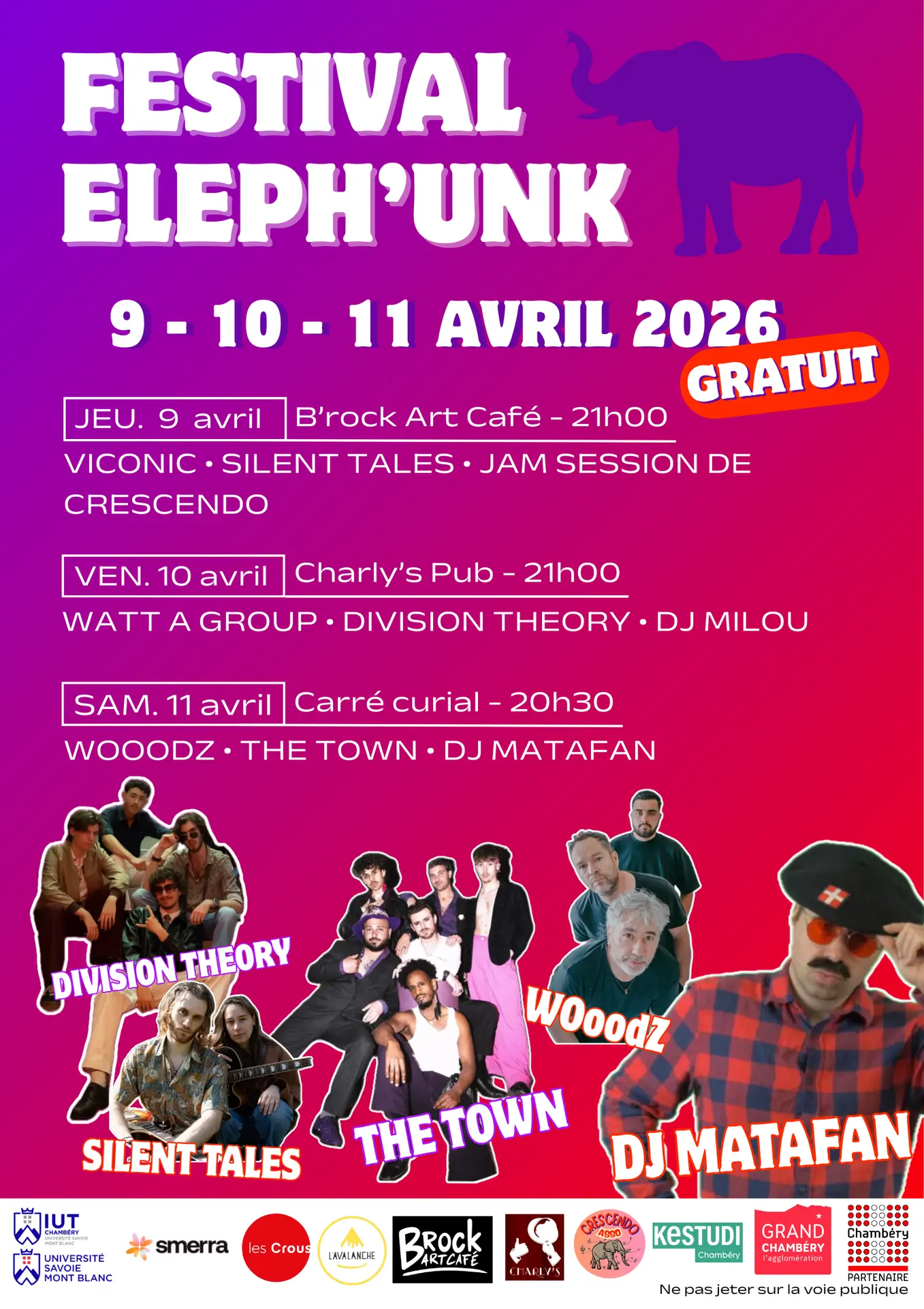 N'hésitez pas à nous rejoindre dans l'ambiance du "Festival Eleph'unk" le 9, 10 et 11 avril 2026 !