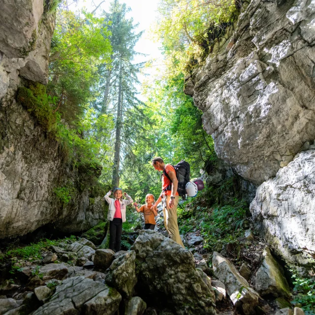 Au détour d’Arith, Massif des Bauges en Savoie, s’ouvre la Grotte de Prérouge. À peine garé, l’aventure commence : une simple minute d’approche suffit pour se retrouver face à cette entrée minérale qui semble inviter à un voyage hors du temps.