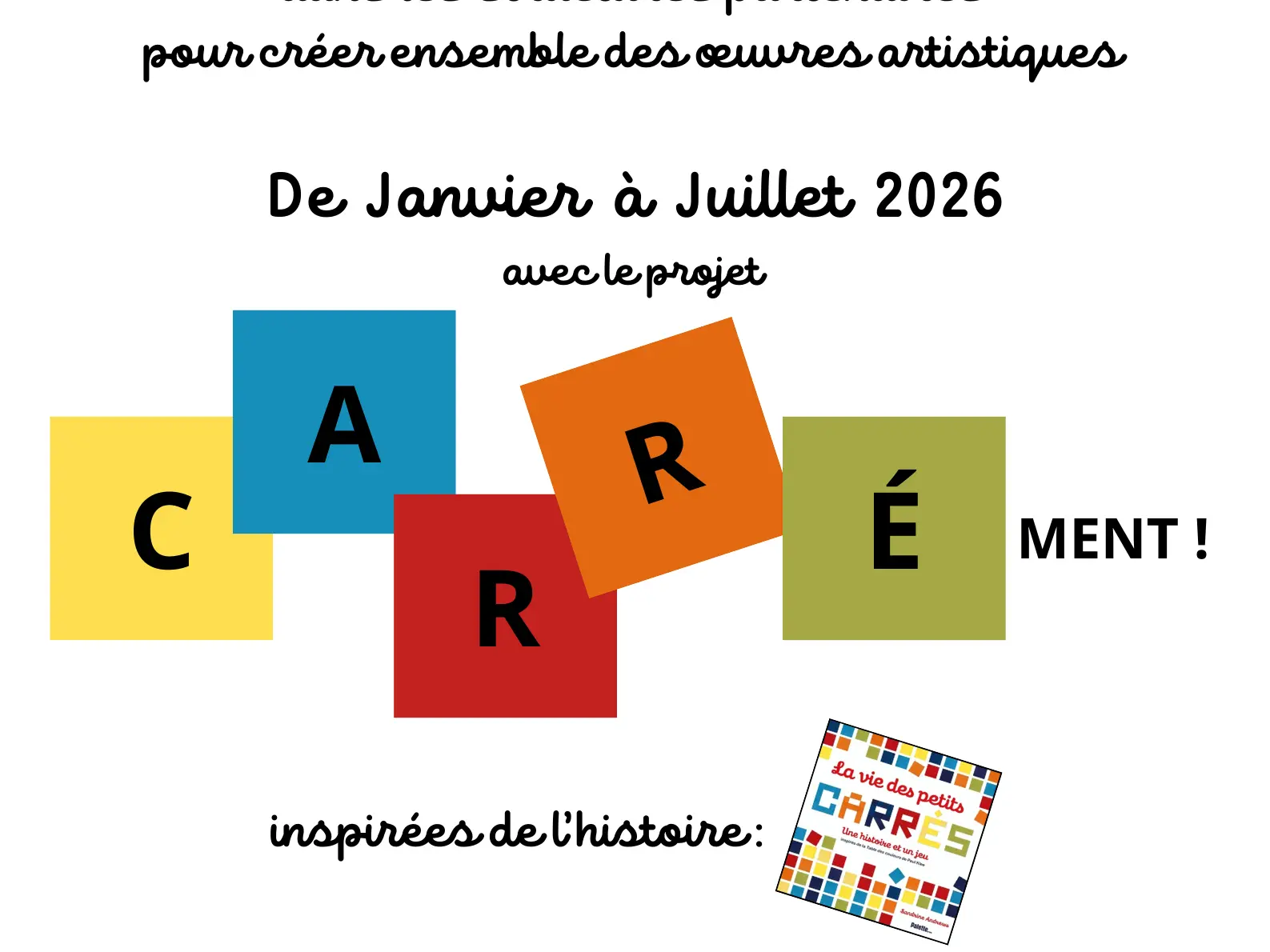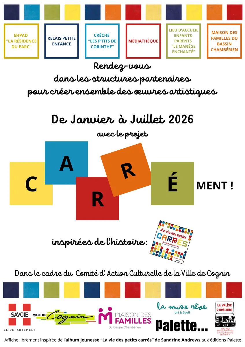 Jusqu’à l’été 2026, des ateliers d’éveil et de médiation artistique sont proposés dans différentes structures de Cognin, autour de la forme géométrique du CARRÉ, à partir de l’album « La vie des petits carrés » de Sandrine Andrews (Palette Éditions , 2018).