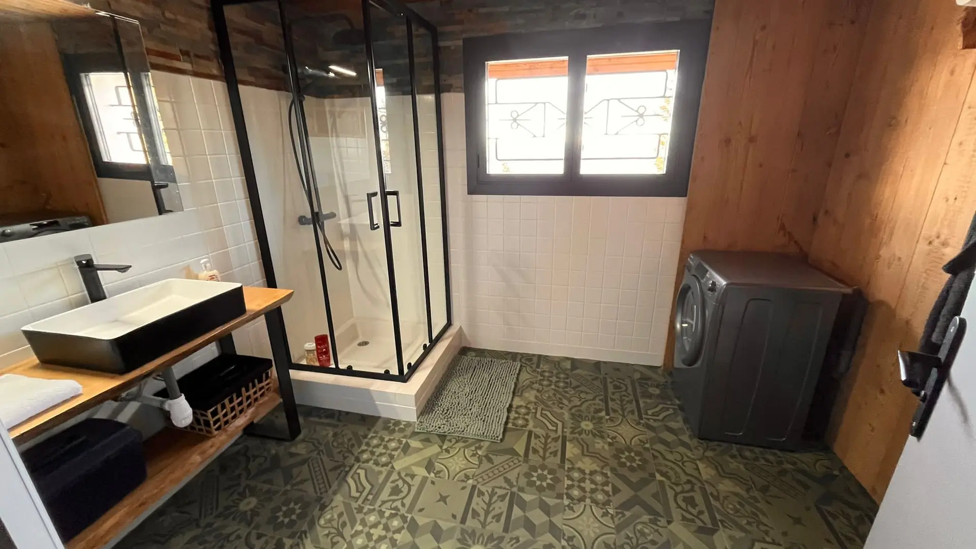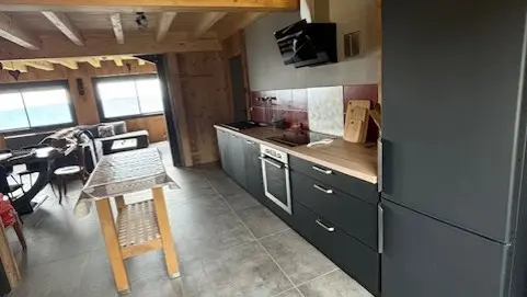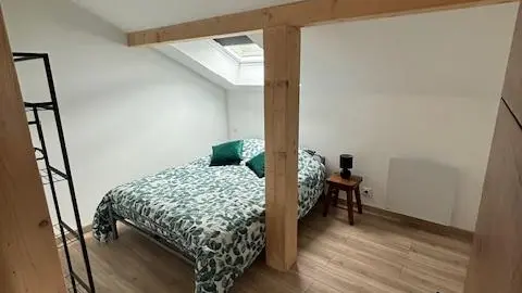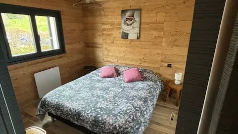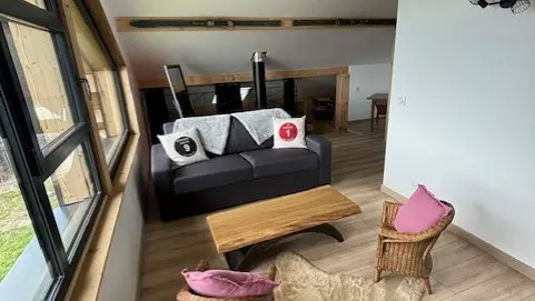 Composé de 2 niveaux : au rdc surélevé une grande pièce de vie (environ 50m2) avec cuisine toute équipée, coin repas, salon et poêle à bois, une chambre avec un lit (160x200), une salle d'eau et wc (en contre-bas, quelques marches).