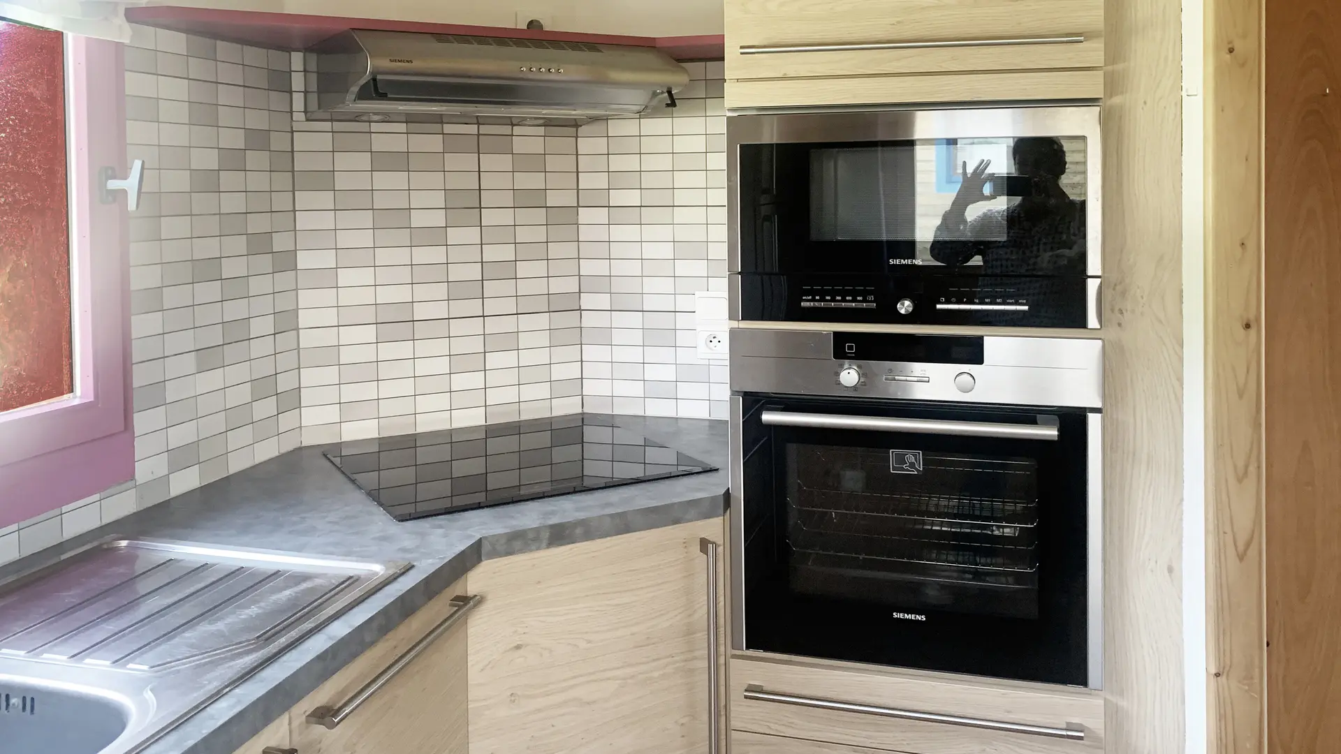 - un coin cuisine équipé d’un frigidaire, plaques de cuisson, four et cafetière électrique.