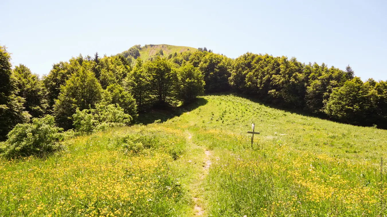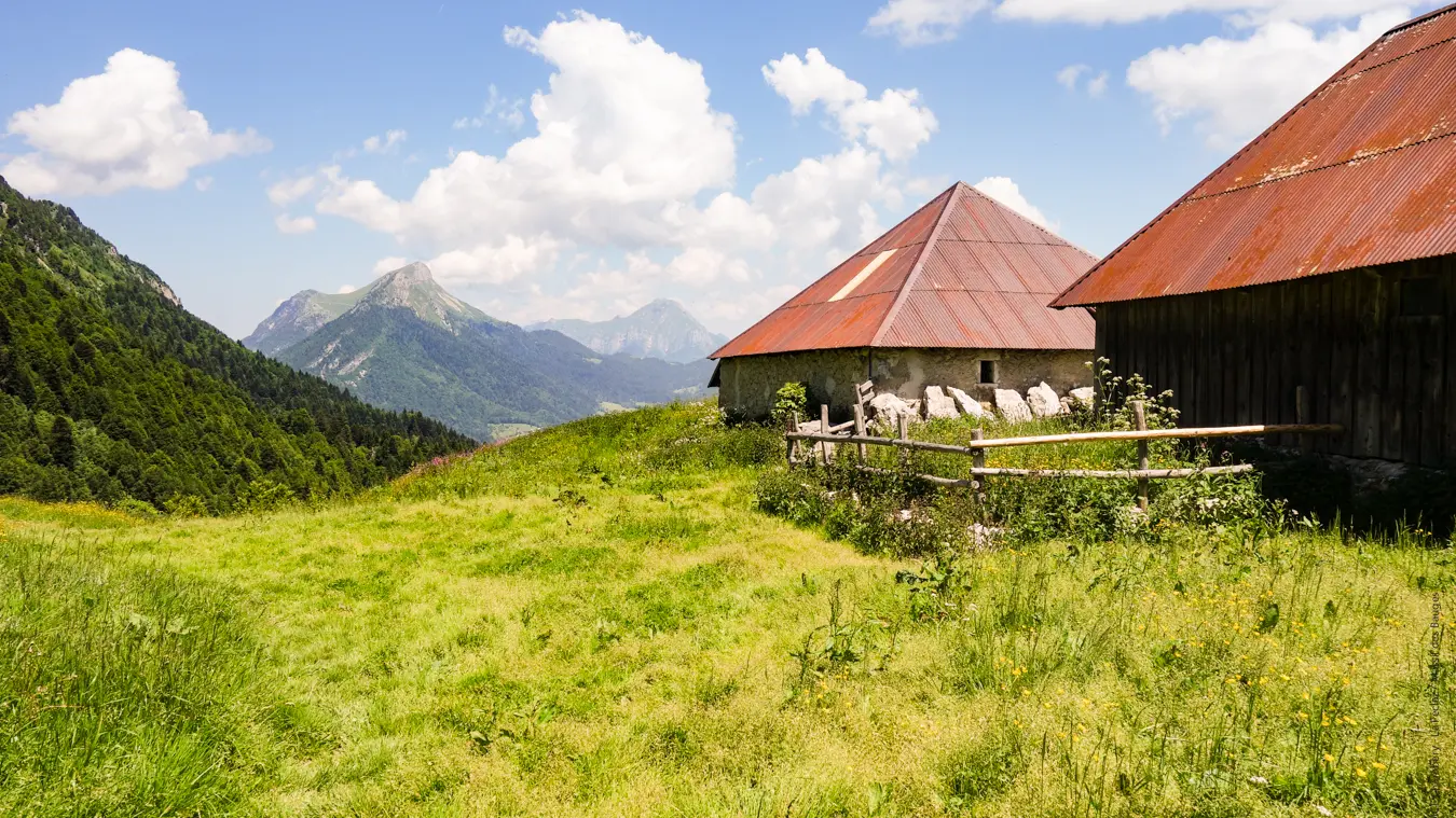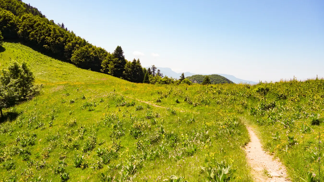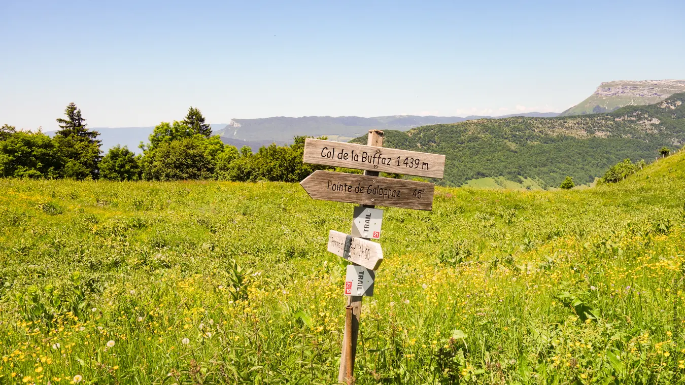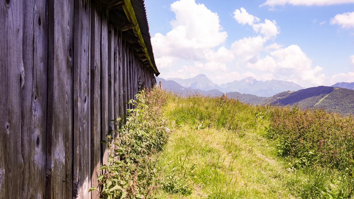 À l'arrivée aux chalets, quelle récompense ! Un paysage alpin à couper le souffle se découvre sous vos yeux. La pause s'impose avant se s'engager dans le dernier single qui mène, en quelques tours de pédales, au col en direction de La Galoppe (Gallopaz). Ce cheminement est un peu plus technique et légèrement exposé parfois, mais très court. Au col, cette fois, même la croix du Nivolet et le plateau du Revard sont visibles. Une fantastique épopée avec vue à 360° sur le massif.