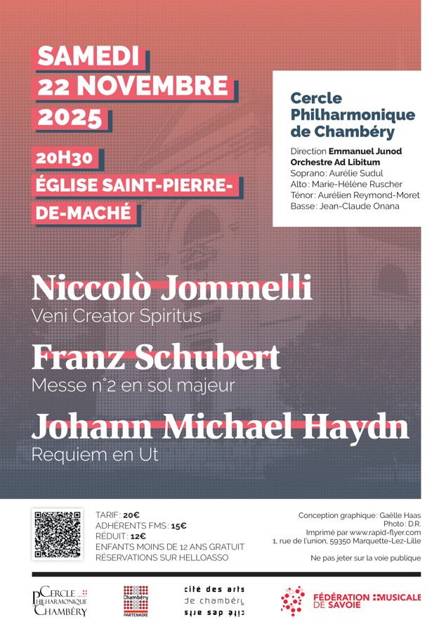 Par le cercle philarmonique de Chambéry. Au programme le « Veni Creator Spiritus » de Niccolò Jommelli (1714 -1774), la « Messe n° 2 en sol majeur D167 » de Franz Schubert (1797 – 1828) et le « Requiem en Ut » de Johann Michael Haydn (1737 – 1806).