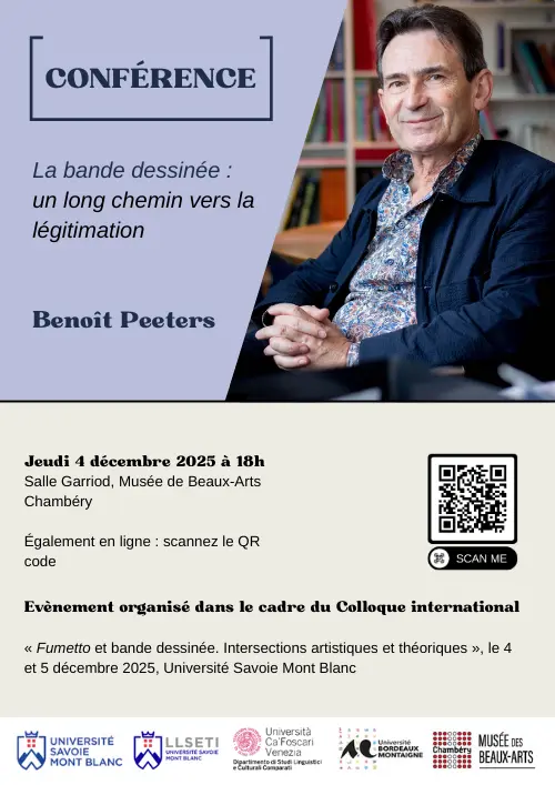 Conférence de Benoît Peeters, écrivain, essayiste, professeur, scénariste et critique français, dans le cadre du Colloque international « Fumetto e bande dessinée. Intersezioni artistiche e teoriche » organisé les 4 et 5 décembre à Chambéry par l’USMB.