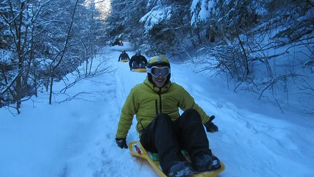 Lugez en forêt et dans les alpages du Revard. 1 km 500 de luge hors piste et balade à pied en luge pour les petits et les grands à la découverte des espaces sauvages du Parc
