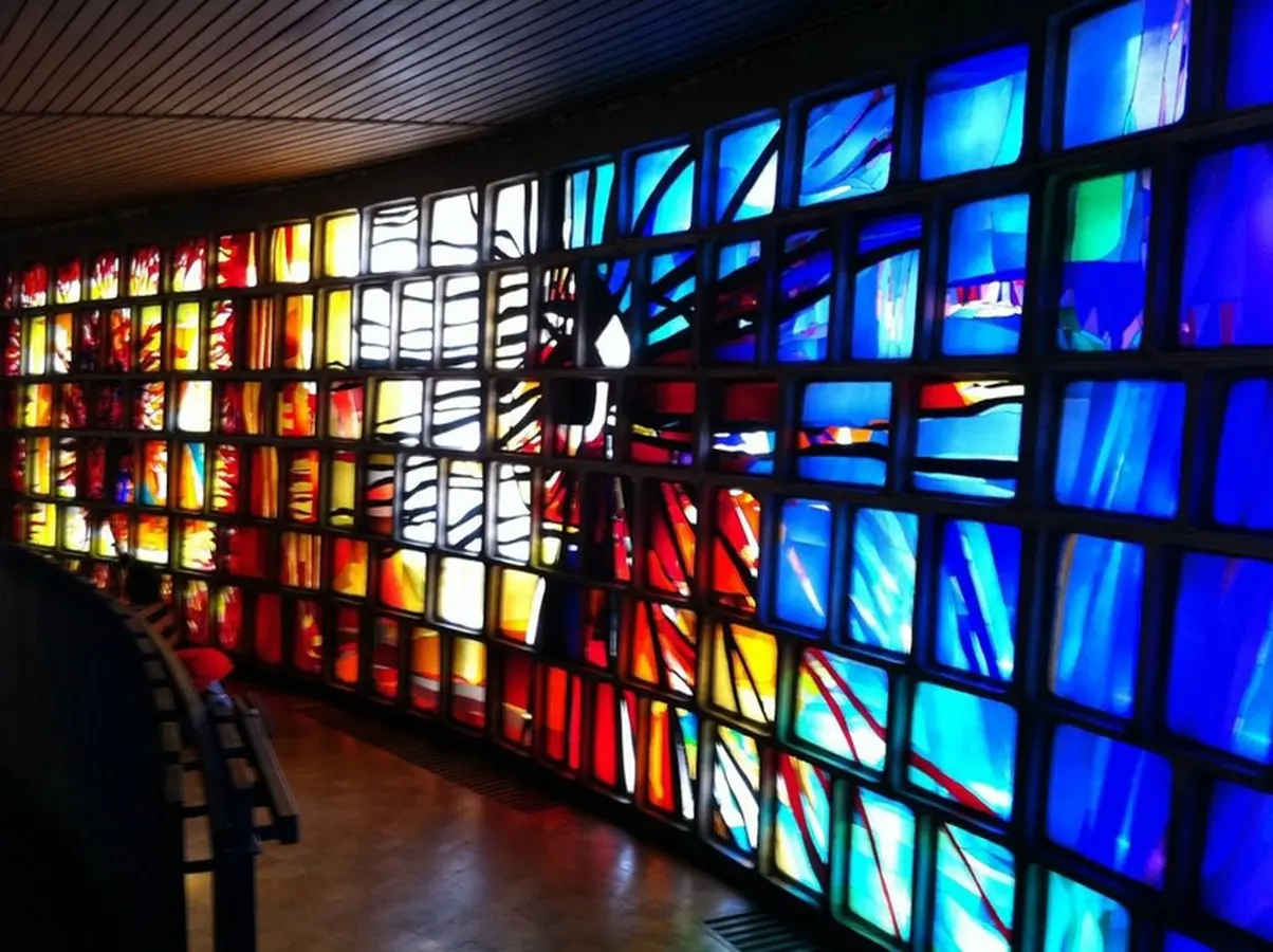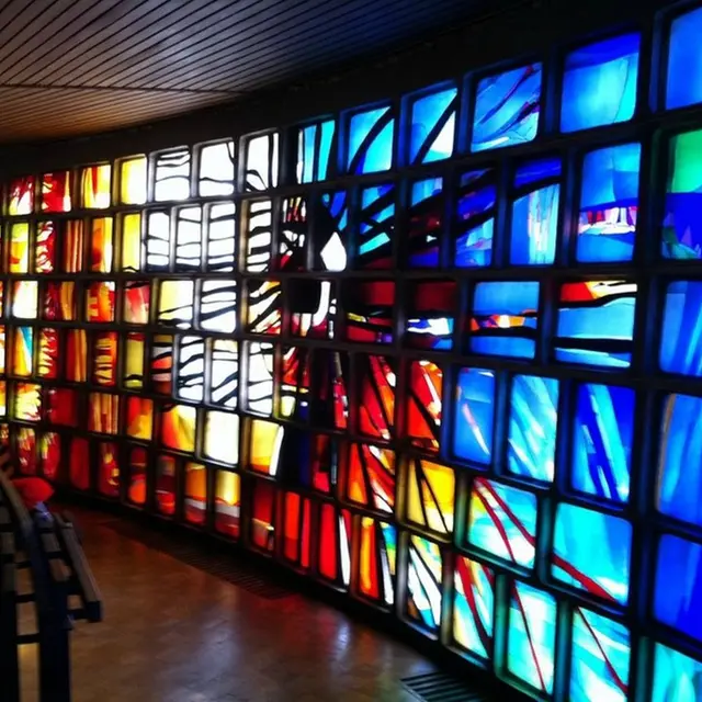 Eglise de plan ovoïde construite entre 1962 et 1966. Architecte Pierre Jomain. Vitraux d'Arcabas.