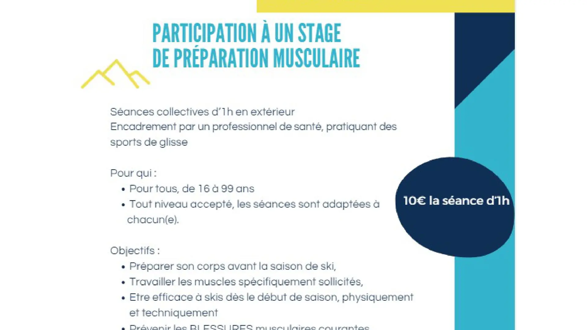 Séances collectives d'1h en extérieur. Encadrement par un professionnel de santé, pratiquant des sports de glisse.
