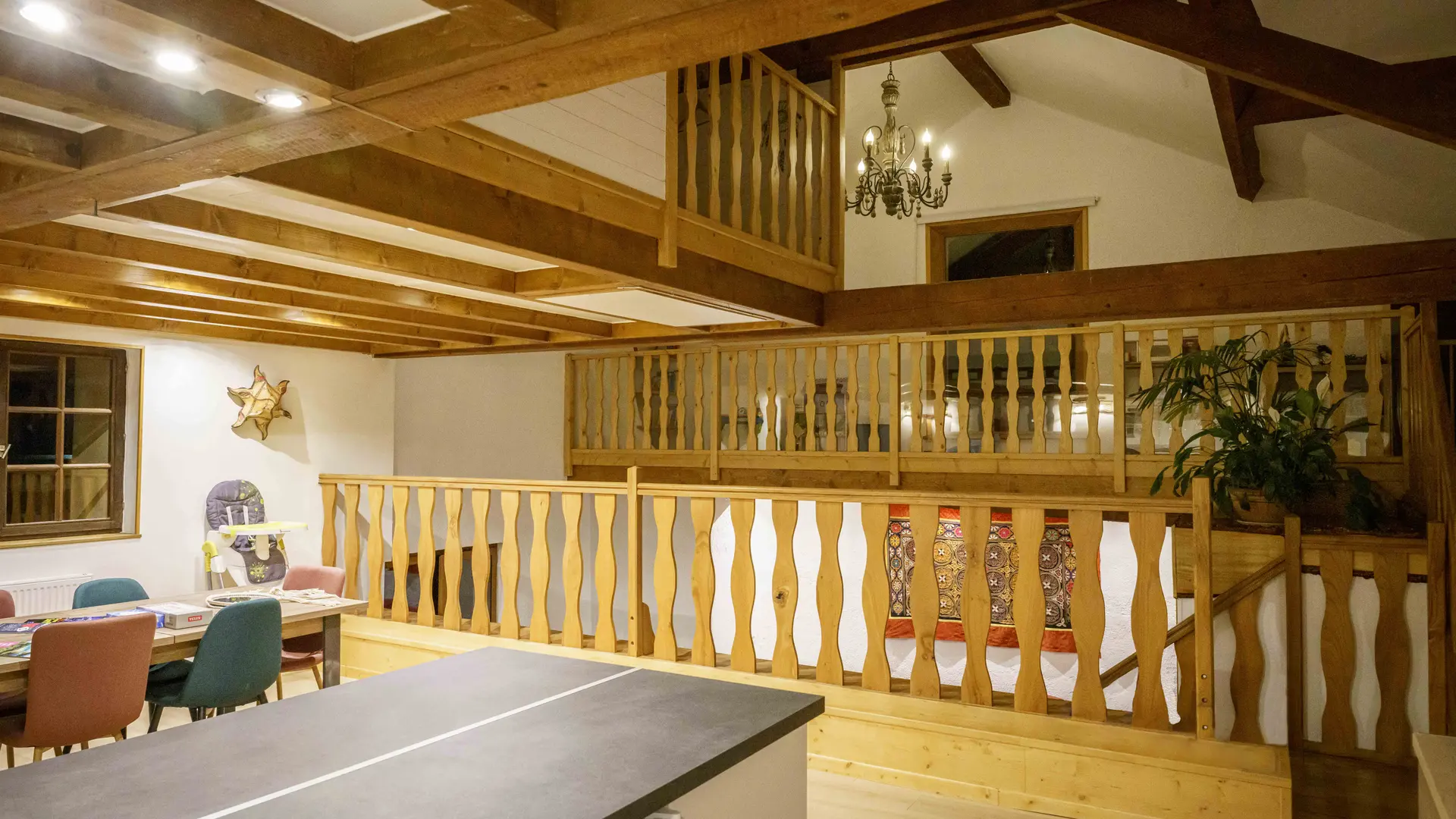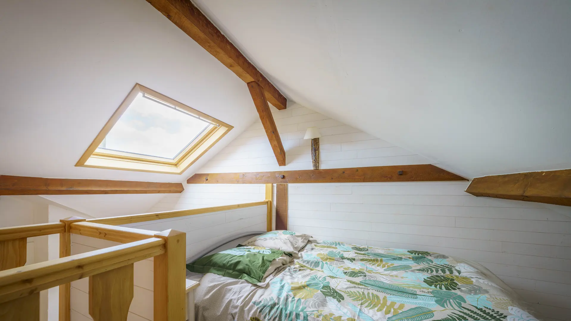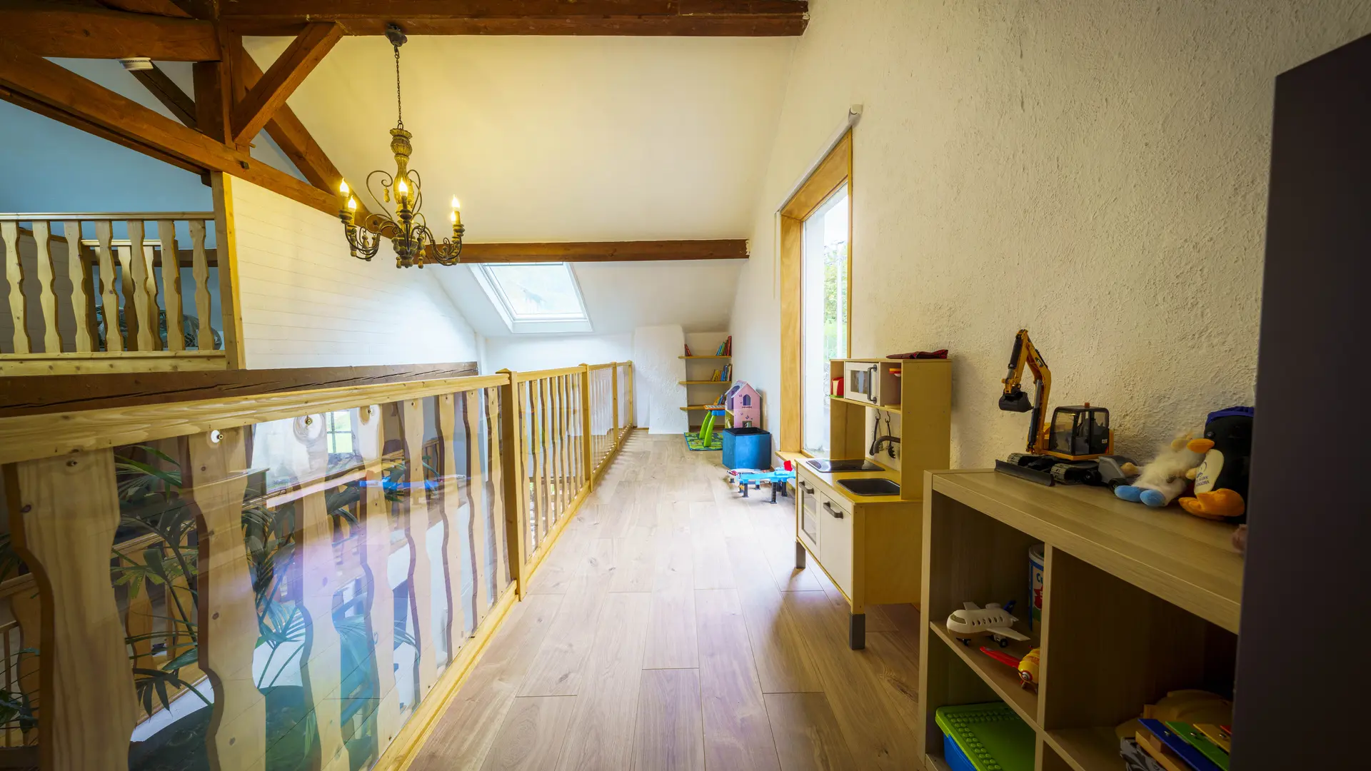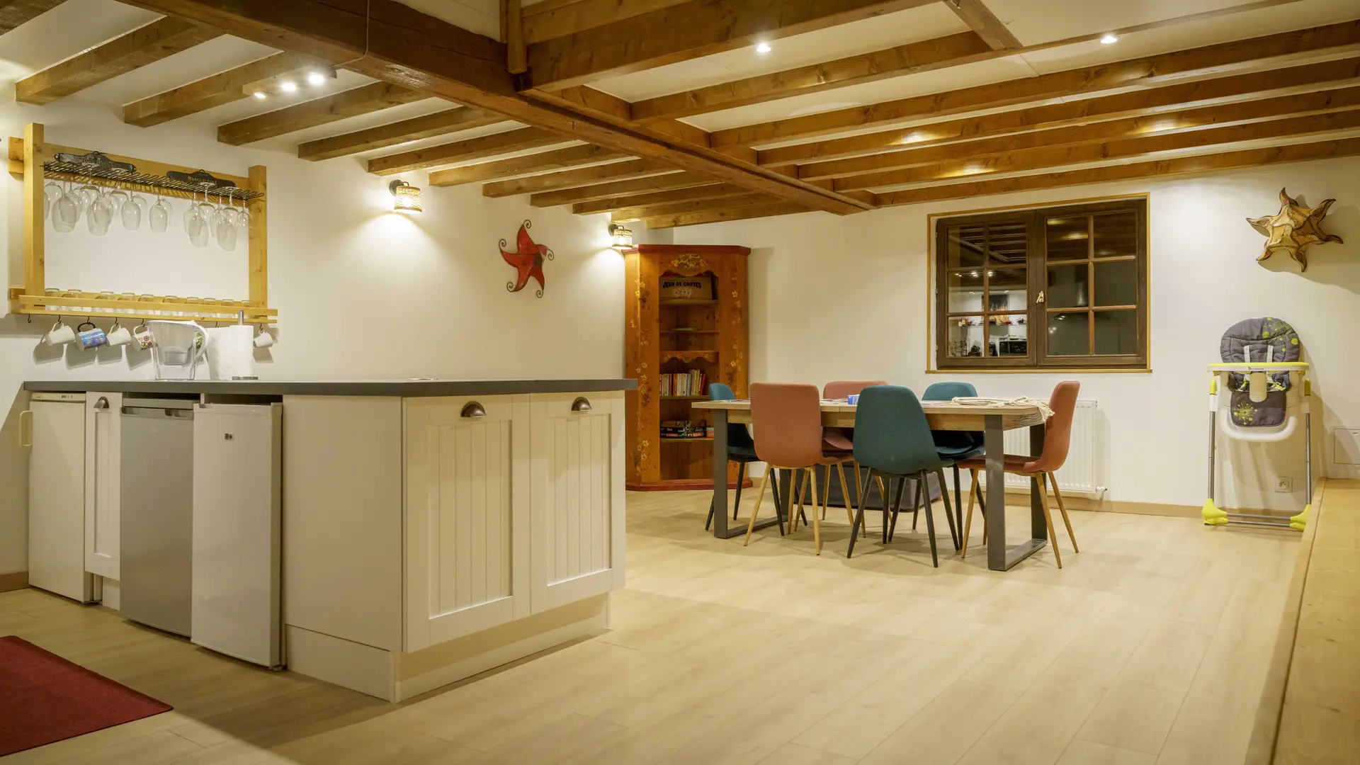 A l'étage : grande salle à manger avec cuisine ouverte, mezzanine avec un lit double et un lit simple, salle de jeux pour les enfants, deux chambres et une salle de bain avec WC.