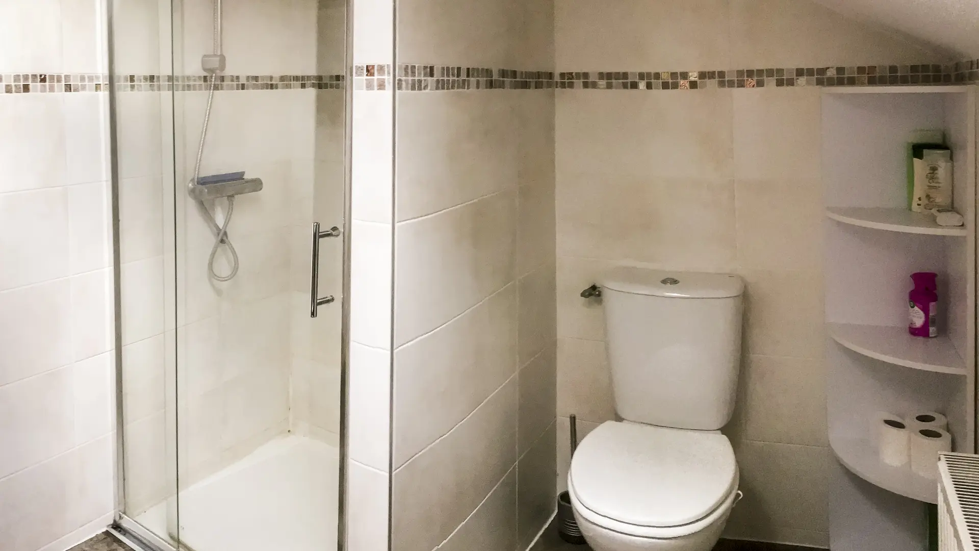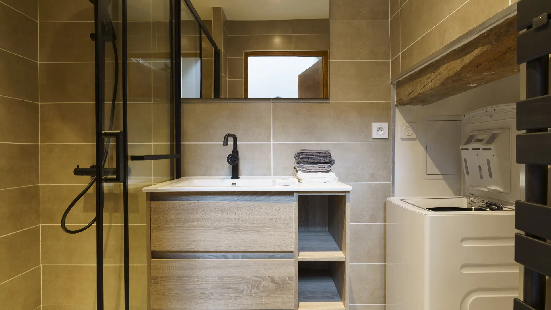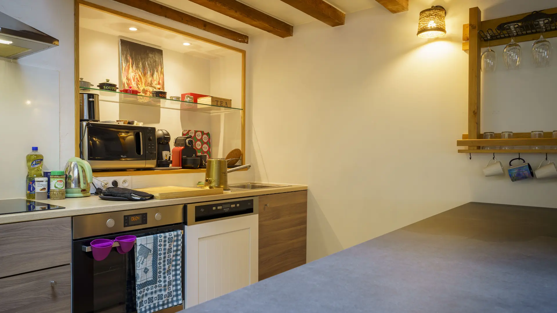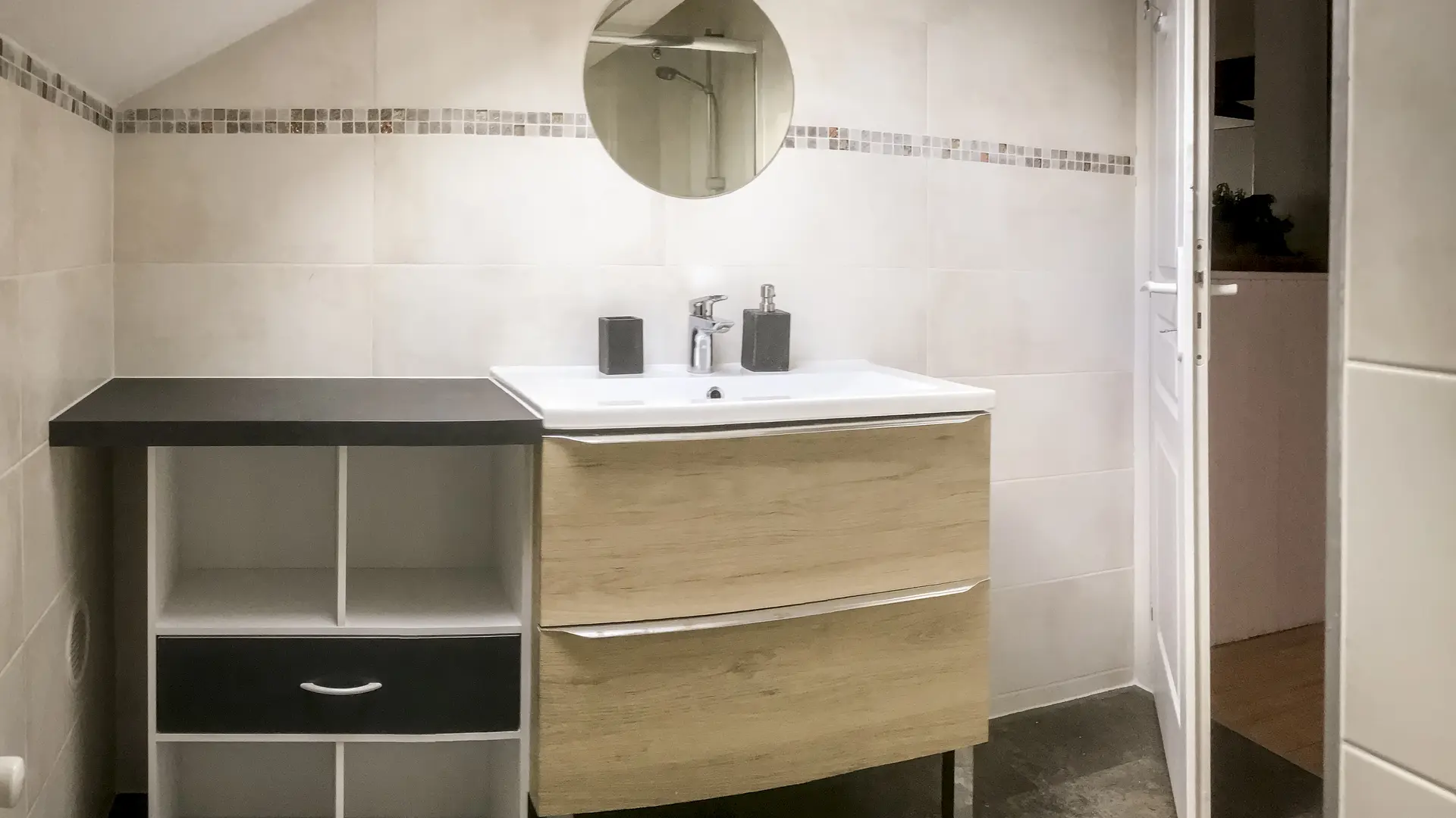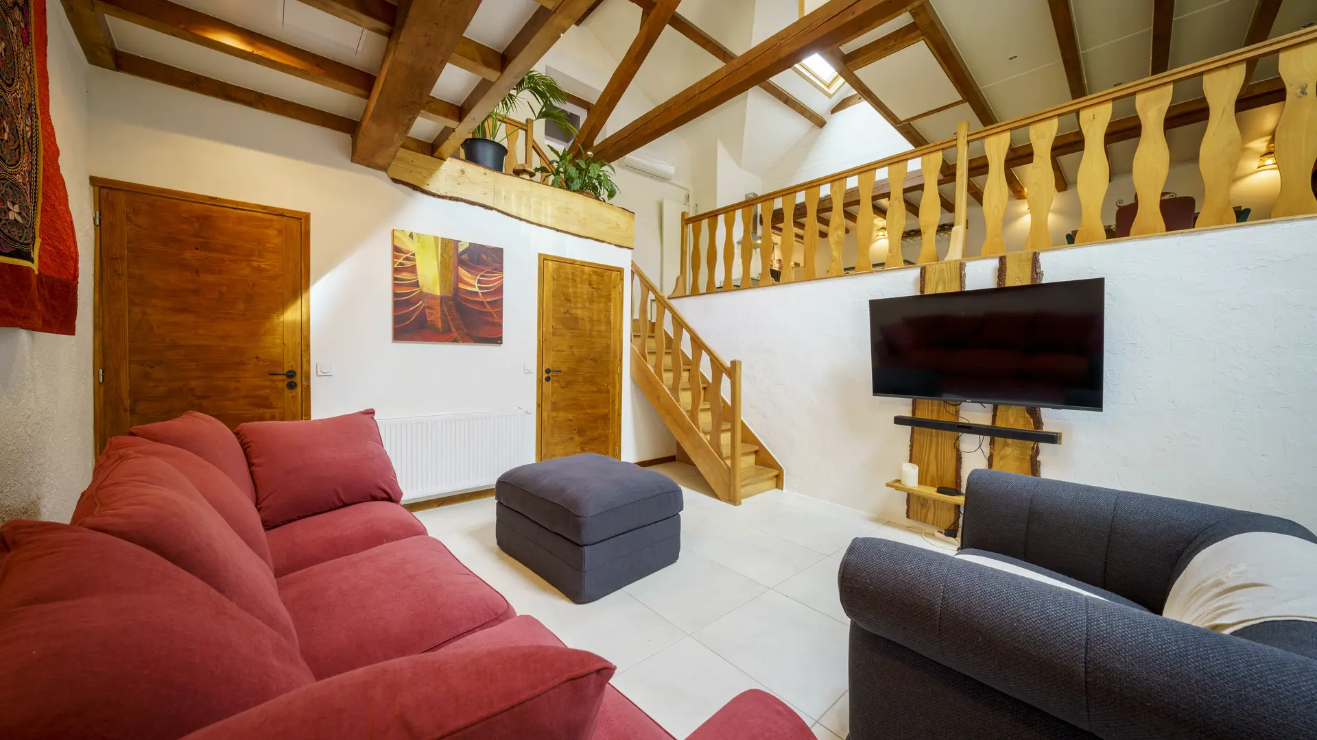 L'entrée se situe au RDC, elle donne sur le salon équipé d'un canapé convertible et d'une TV HD, d'une salle de bain et d'un WC séparé.