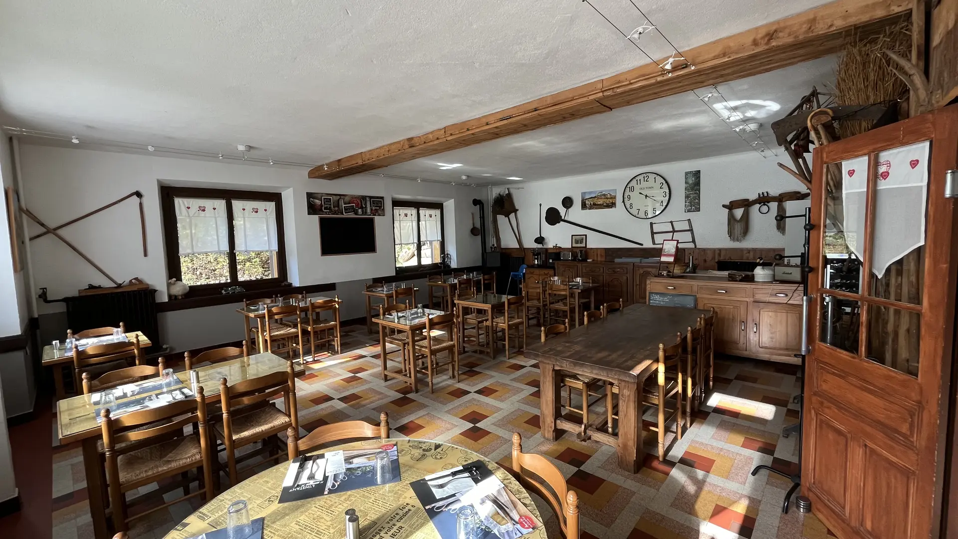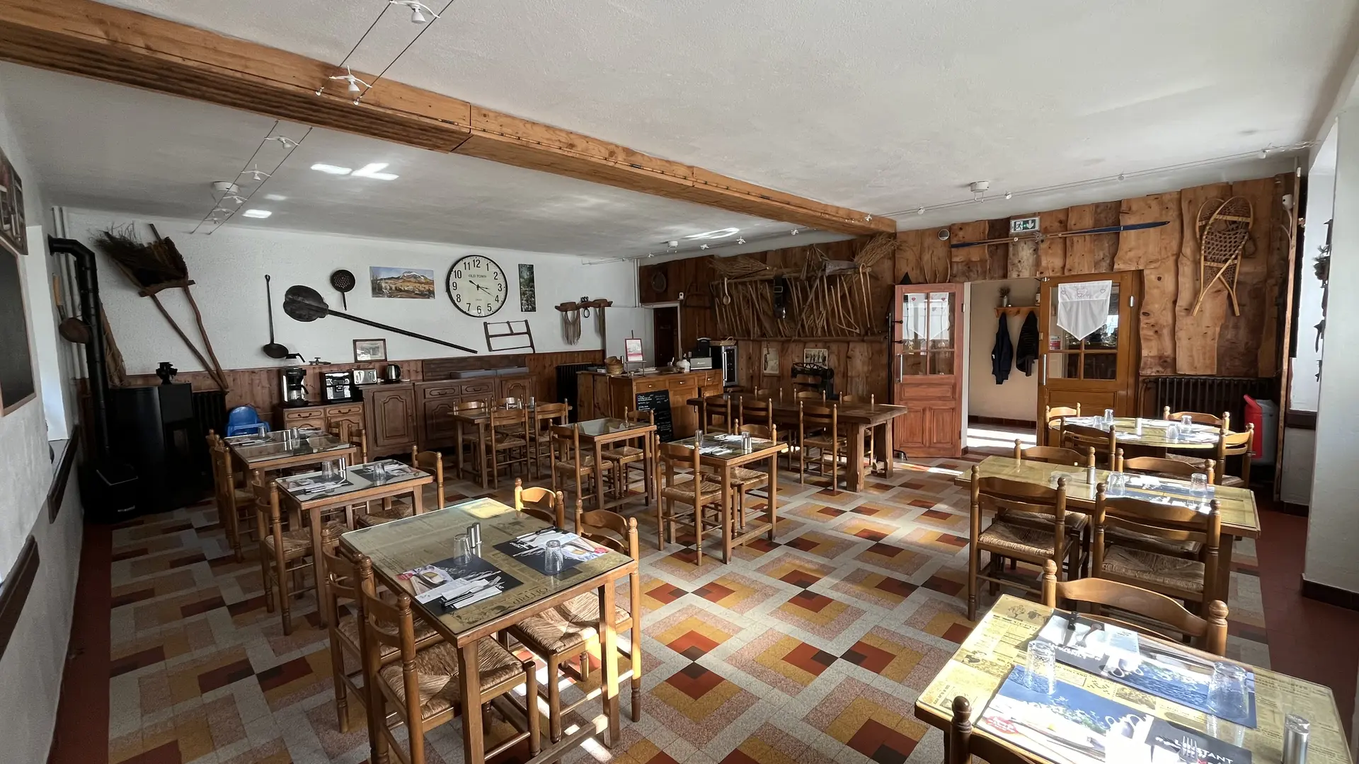 Salle typique savoyarde, avec feu de cheminée et chandelles.