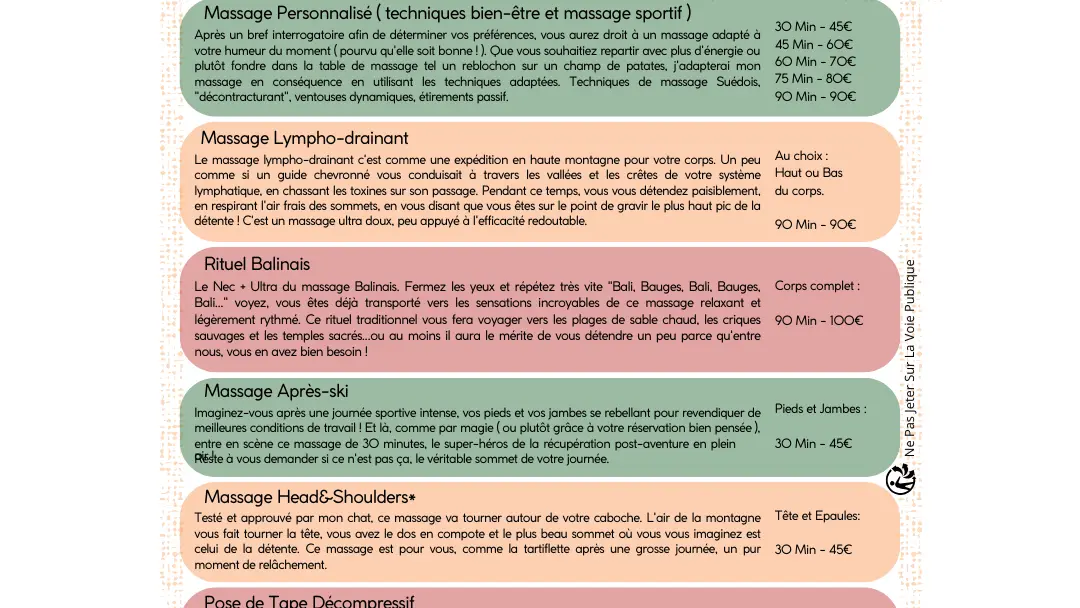 Mon approche? Des massages sportifs et détentes un peu dépoussiérés! Authenticité, écoute et professionnalisme sont au programme pour vous offrir le soin dont vous avez besoin et envie. Mais tout cela avec un peu de fun, car il me semble important d’apporter une nouvelle image du massage afin d’amener le plus de monde possible à prendre soin de soi.