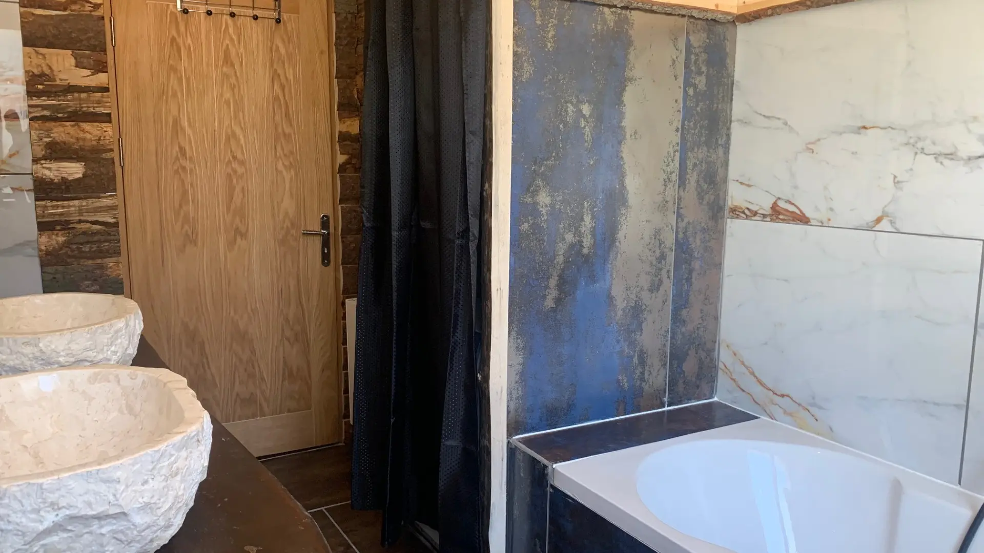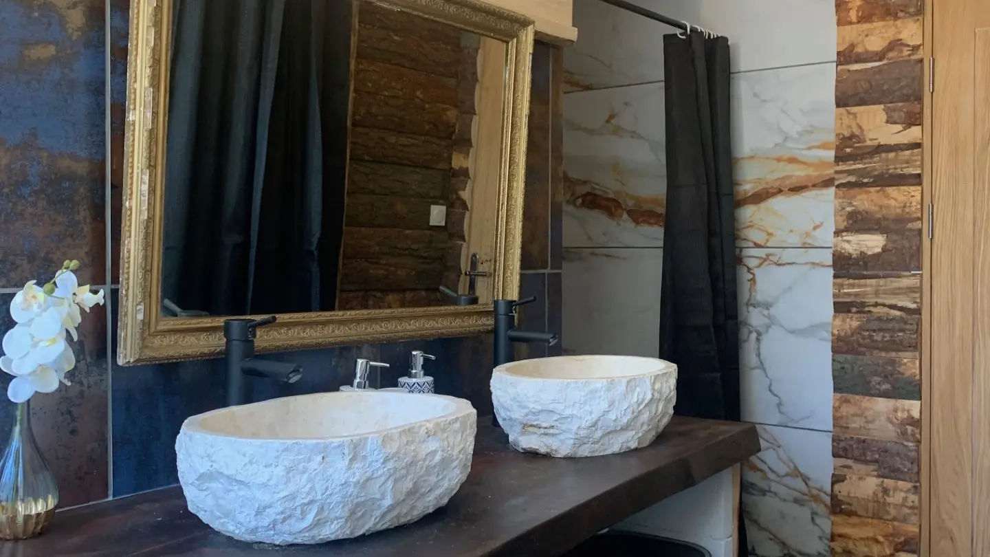 deux chambres lumineuses, une cuisine équipée, une cheminée pour réchauffer les soirées d’hiver, et une double baignoire où le temps s’étire à deux.
