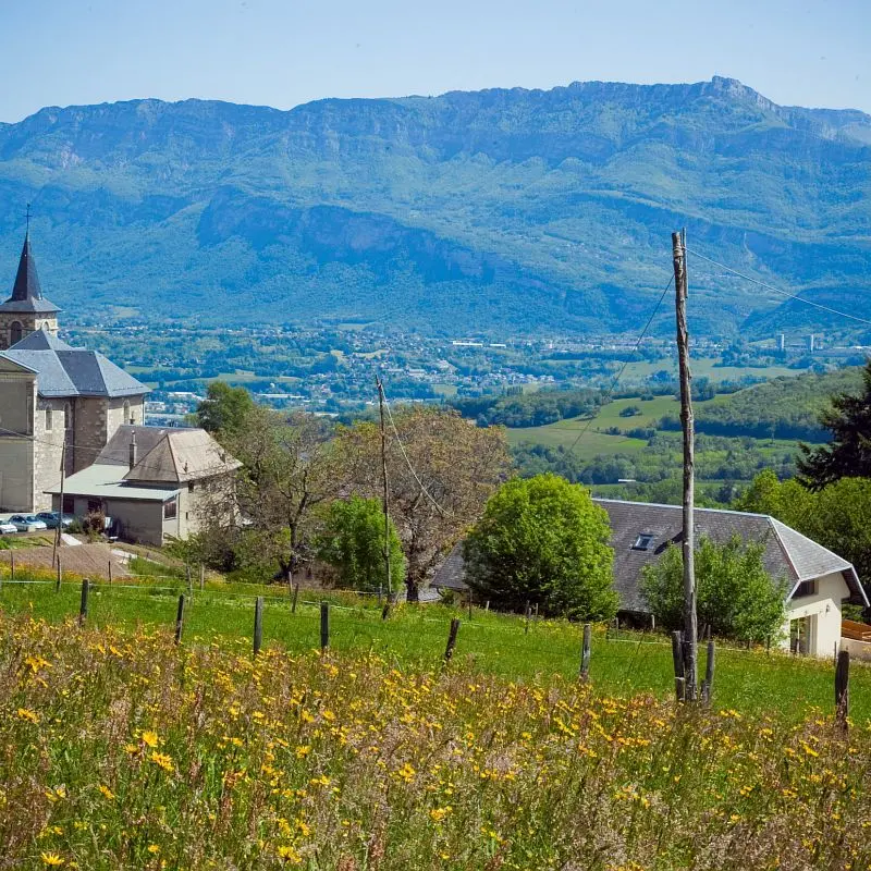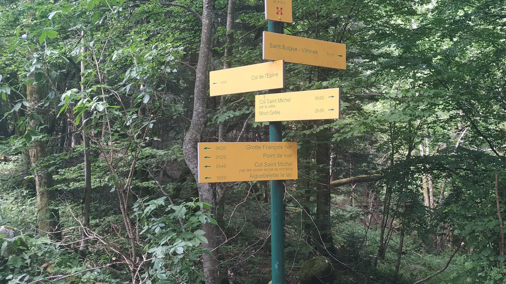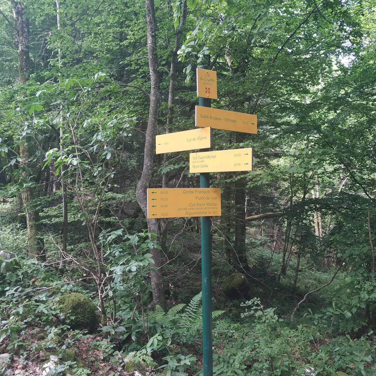 6/ Laissez les directions vers Aiguebelette et le Col du Crucifix pour emprunter à gauche le sentier balisé vers le Mont Grêle qui est indiqué à 1h40. L'itinéraire va passer aux Soualets.