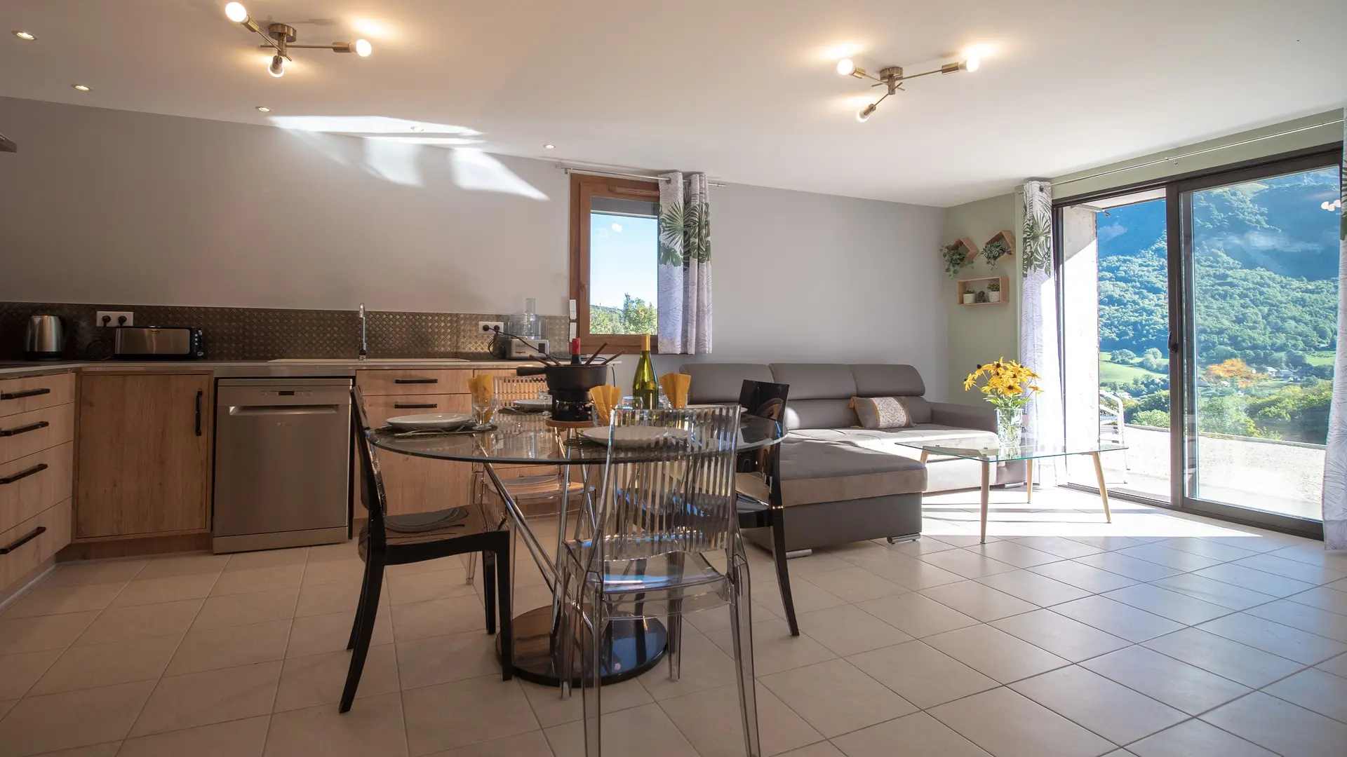 Le gîte dispose d’un grand séjour lumineux de 27 m², avec une cuisine ouverte entièrement équipée et de nombreux rangements libres.