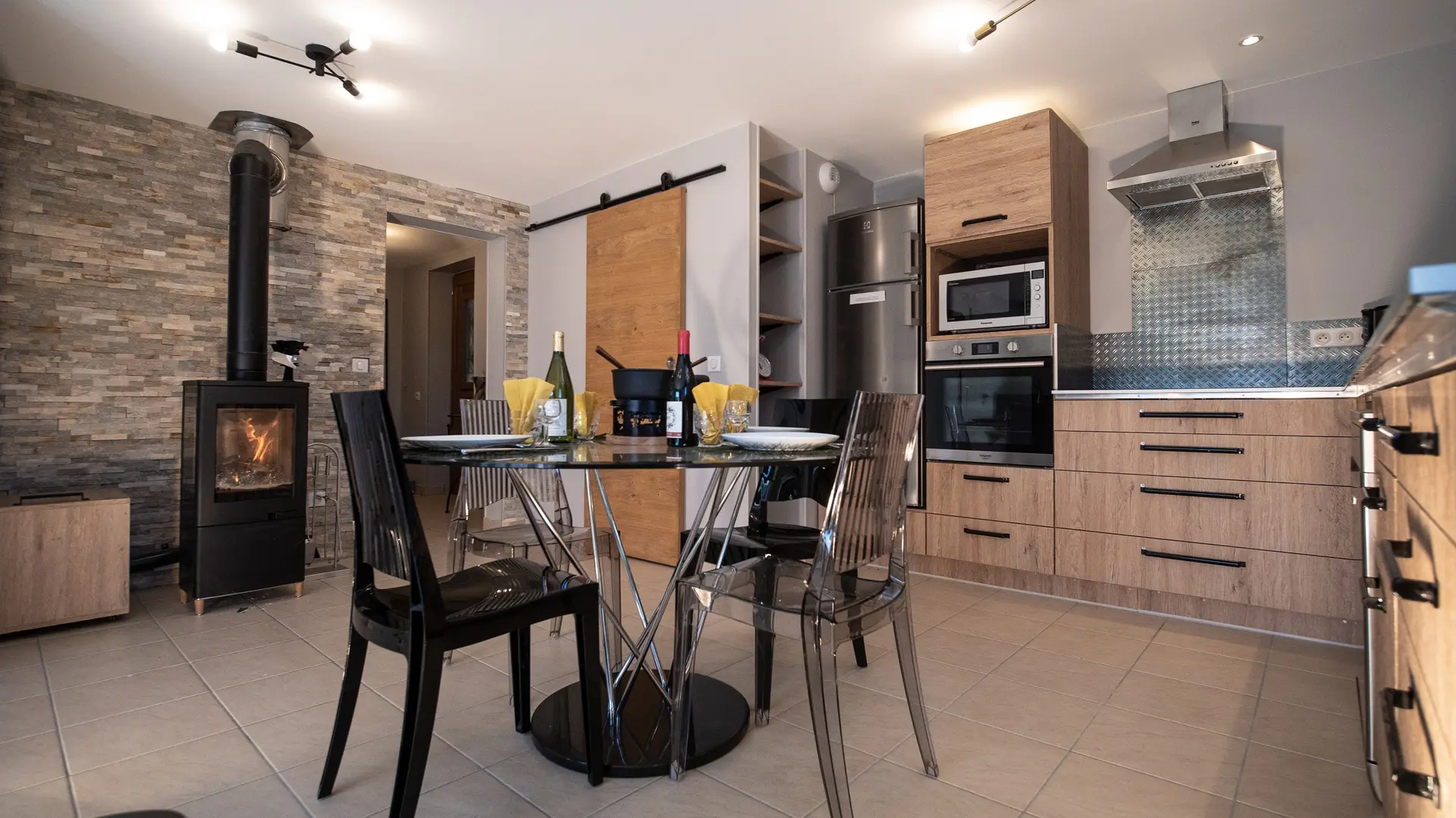 Chaleur et cocooning : En plus du chauffage au sol, profitez d’un poêle à bois (bois fourni) pour des soirées conviviales au coin du feu.