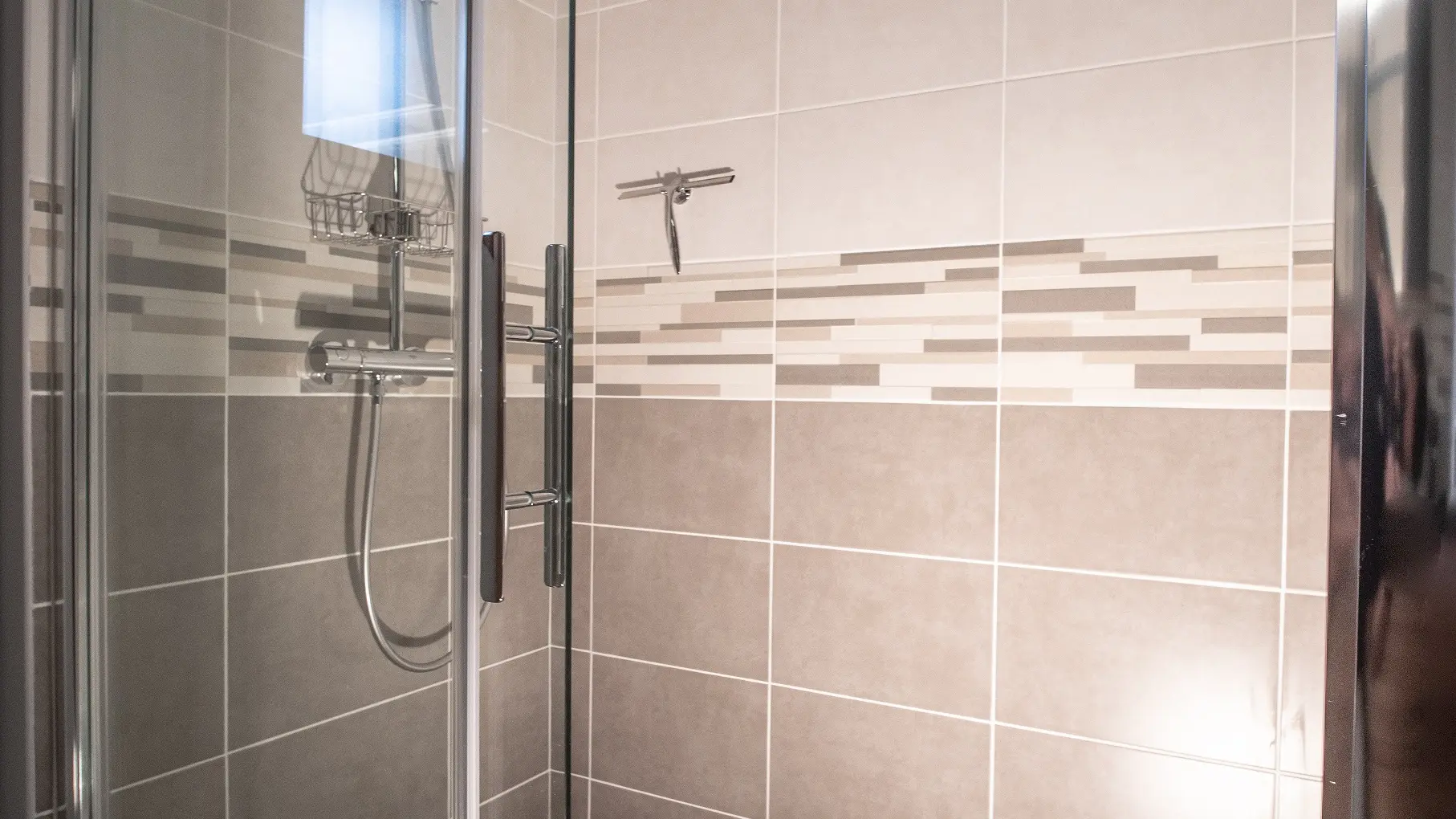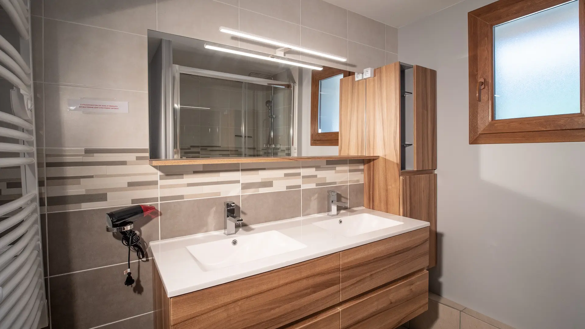 Salle d’eau moderne : Grande douche à l’italienne, double vasque, nombreux rangements.