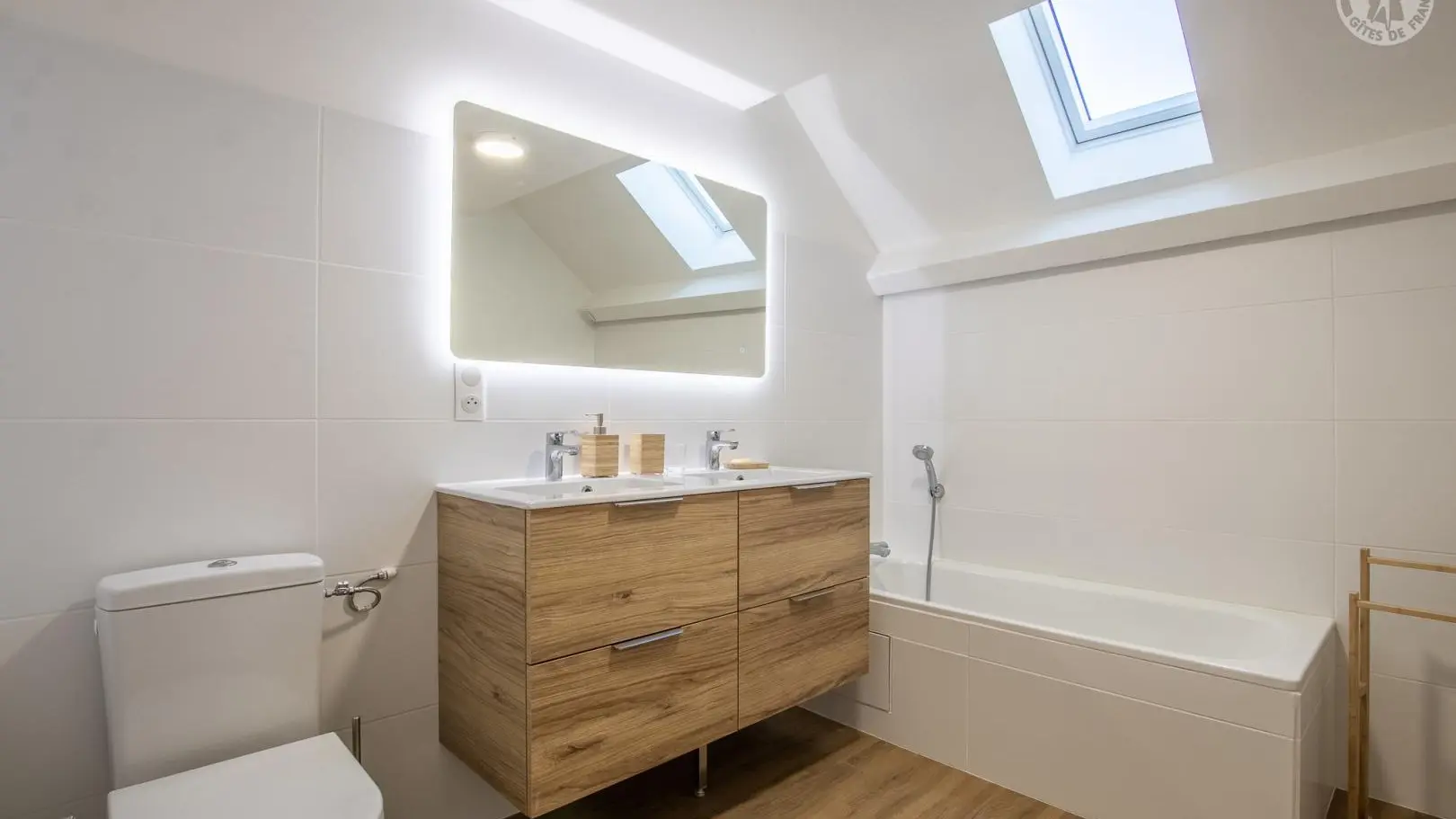 1er étage : un salon (2 canapés 2 personnes 140x190 cm, un petit lit pour enfant 70x180 cm), 2 chambres en sous-pente (1 lit 2 personnes 160x200 cm / 1 lit 2 personnes 160x200 cm), une salle d'eau (douche), une salle de bains (baignoire et WC).