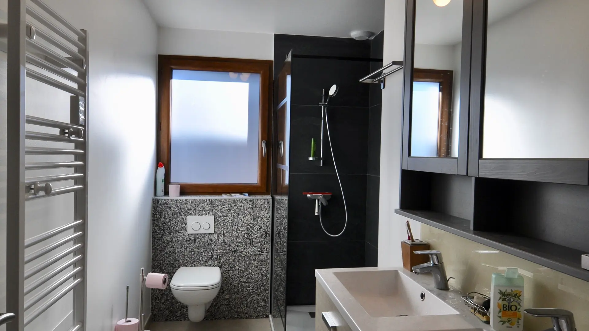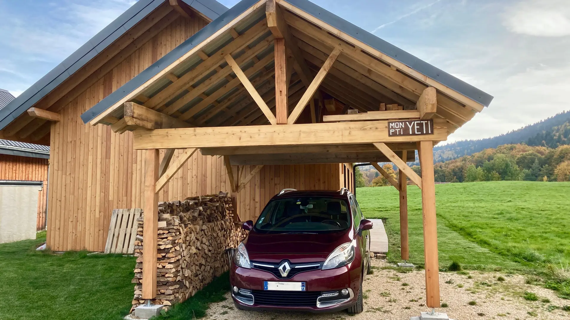 Le chalet dispose d’un carport avec prise pour recharger une voiture électrique, et d’une terrasse plein sud.