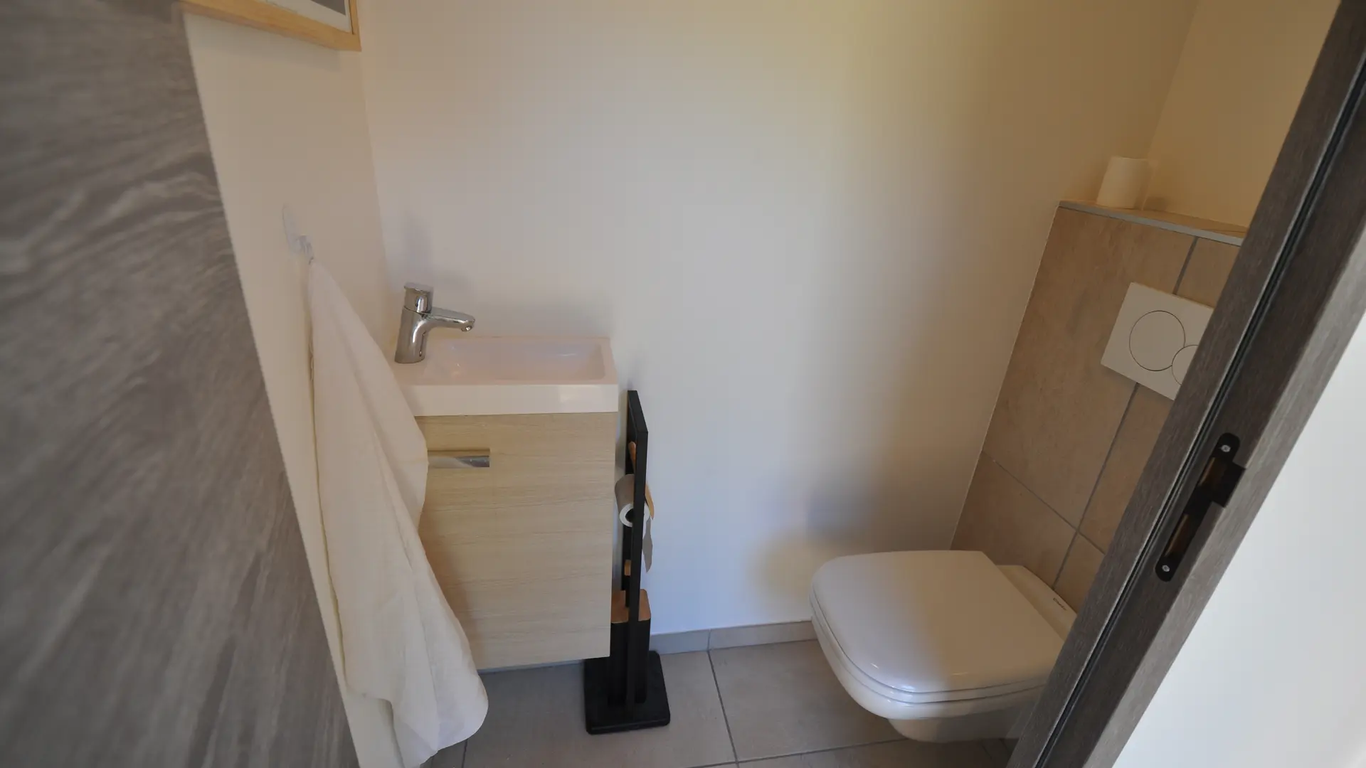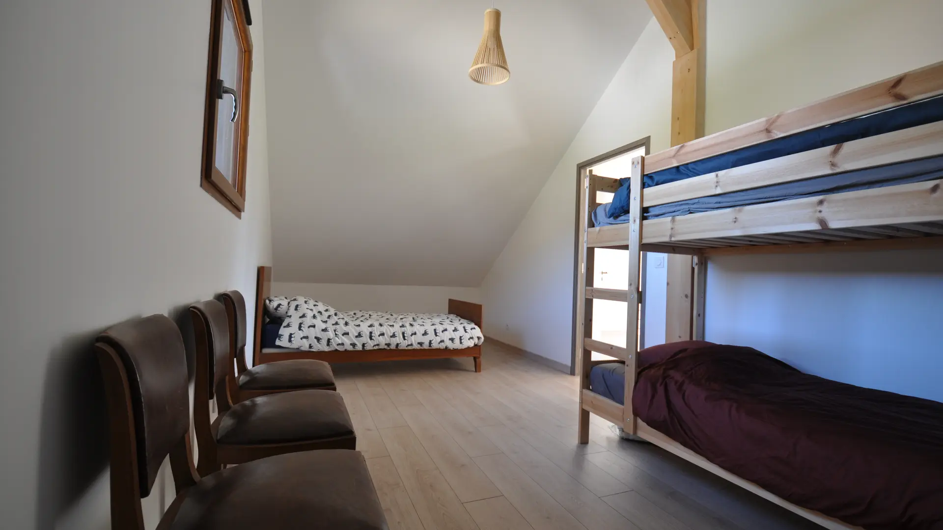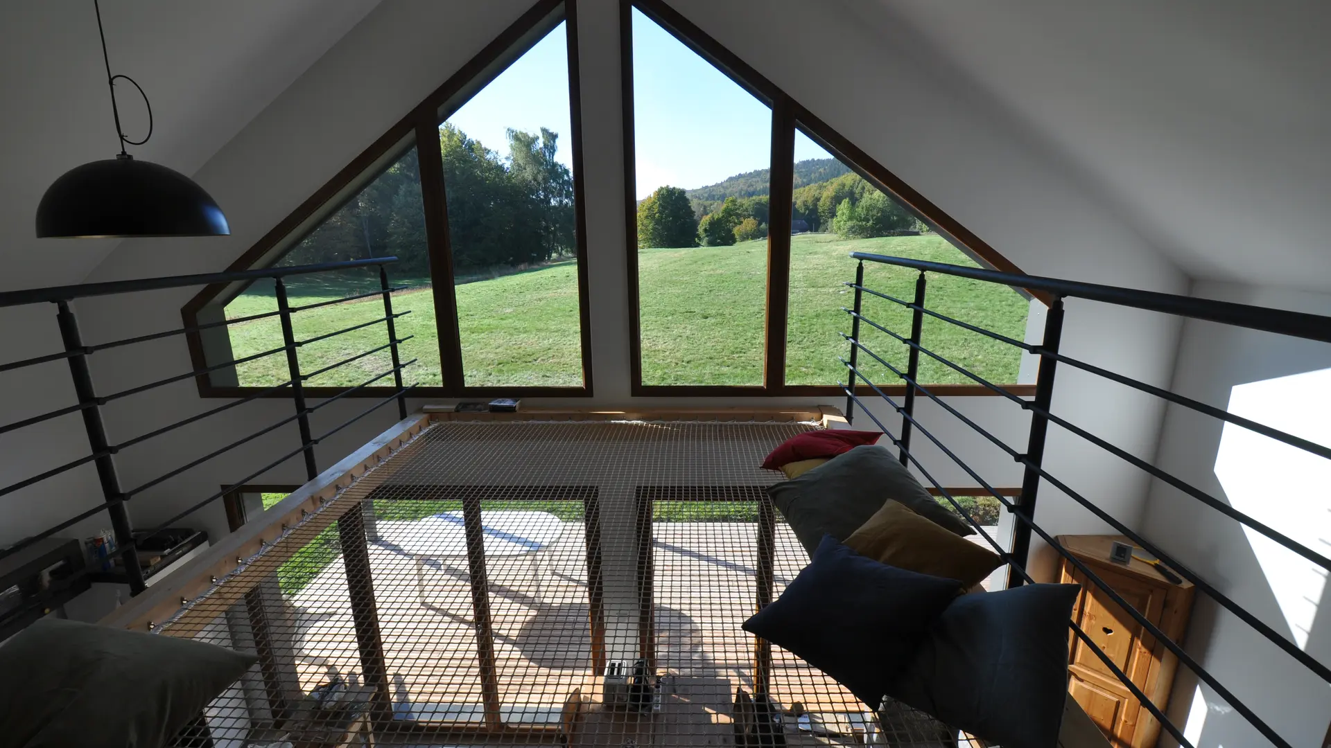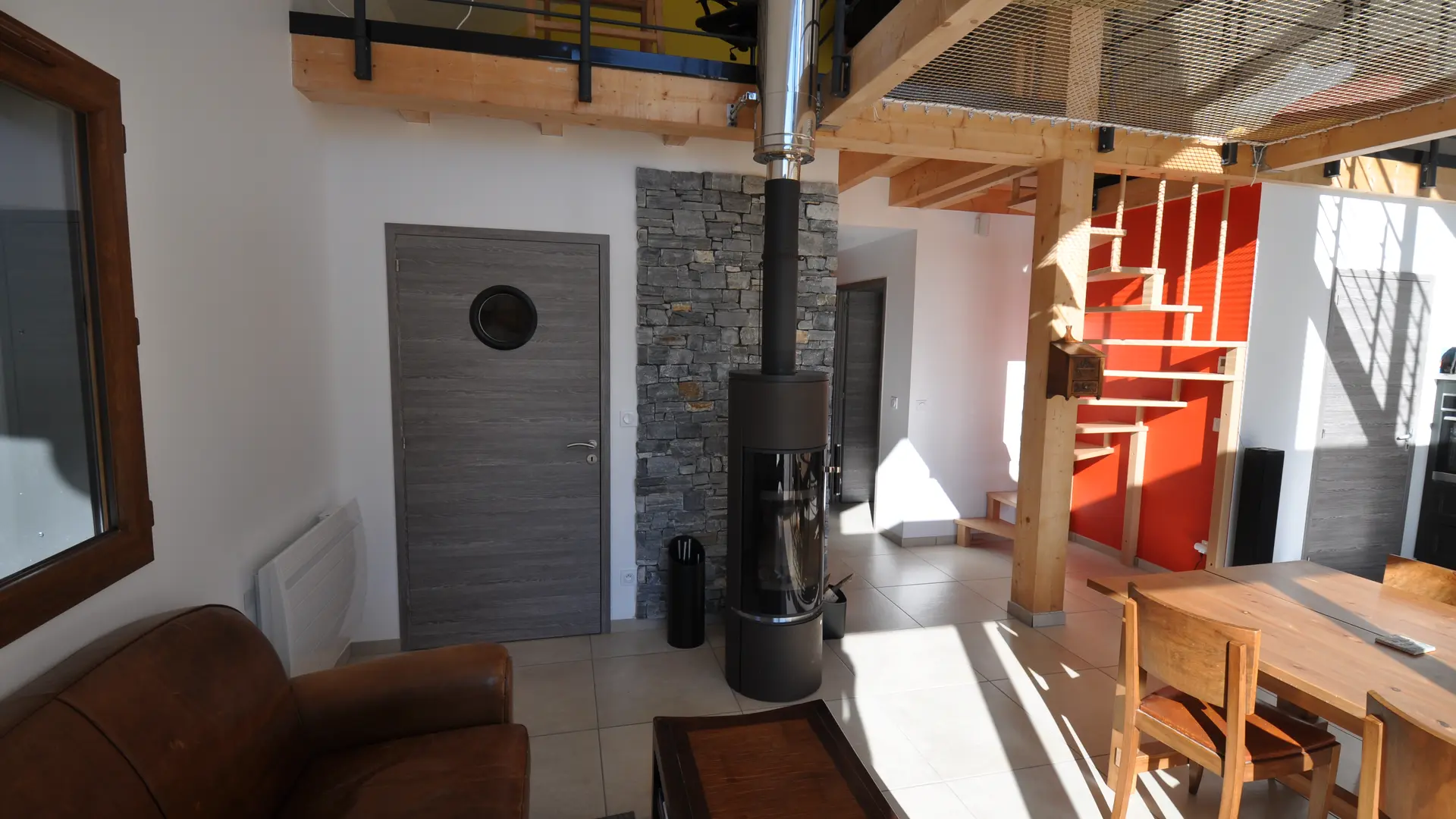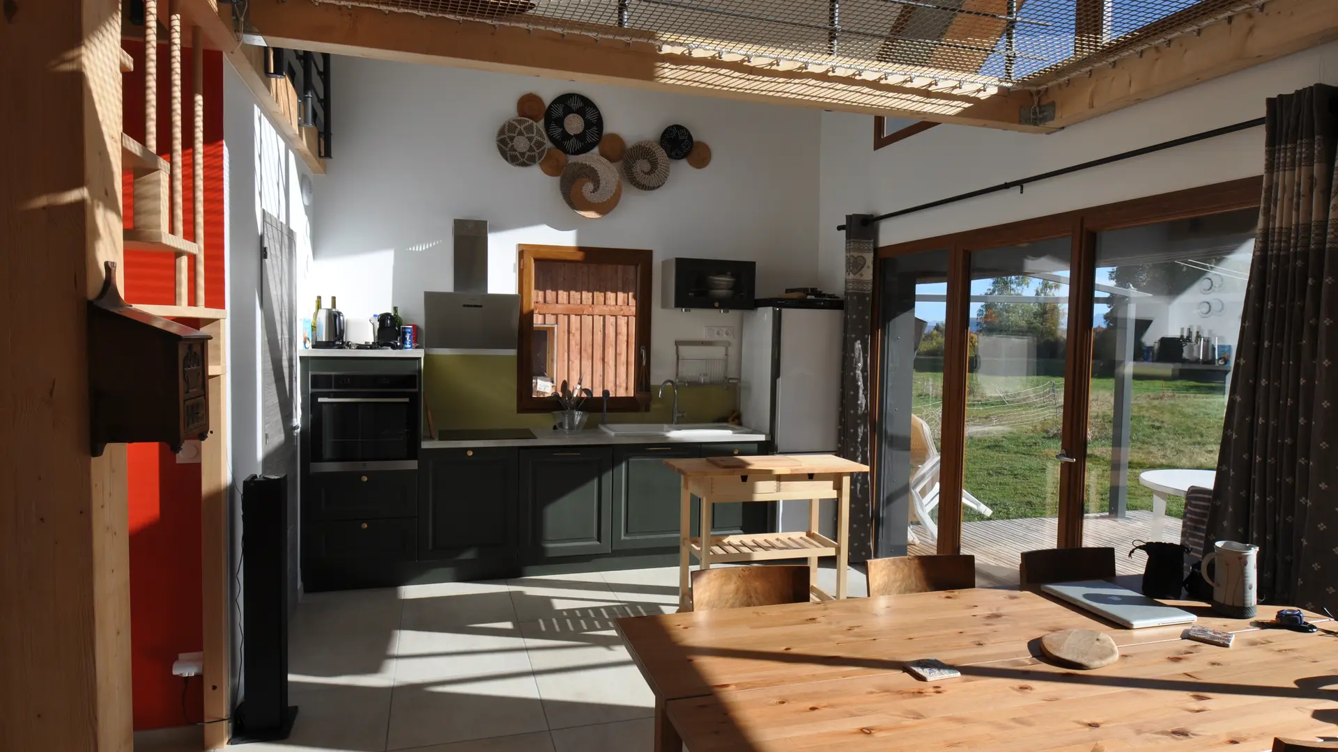 . Au-dessus du vaste séjour salon cuisine, un filet de catamaran permet aux jeunes et aux moins jeunes de bénéficier d’une impression d’apesanteur. Au rez-de chaussée se trouvent deux chambres avec lits doubles, une vaste salle de bain WC, et des toilettes ; à l’étage, un coin mezzanine, et une chambre dortoir équipée de 3 lits simples. Le chauffage est électrique, mais un poêle à bois moderne est présent pour faire une belle flambée et profiter d’une chaleur douce.