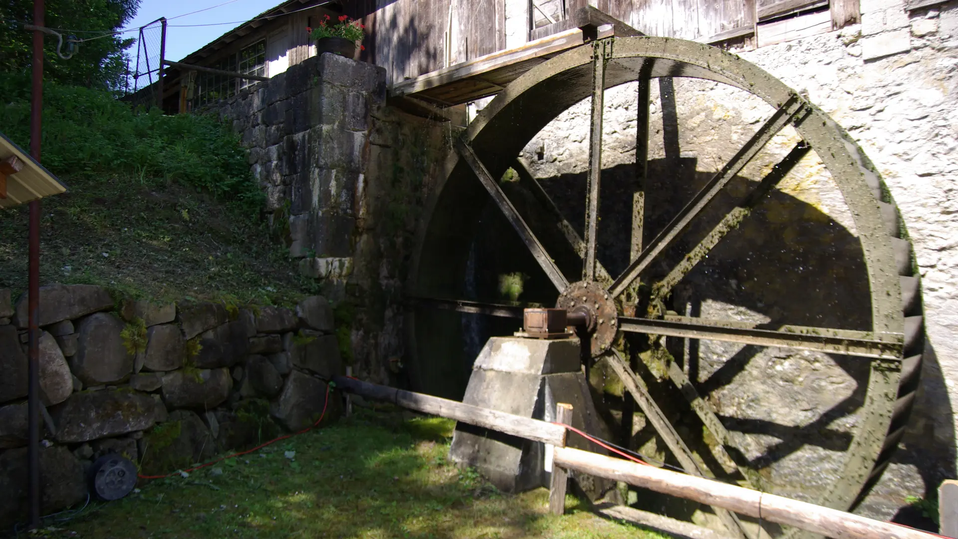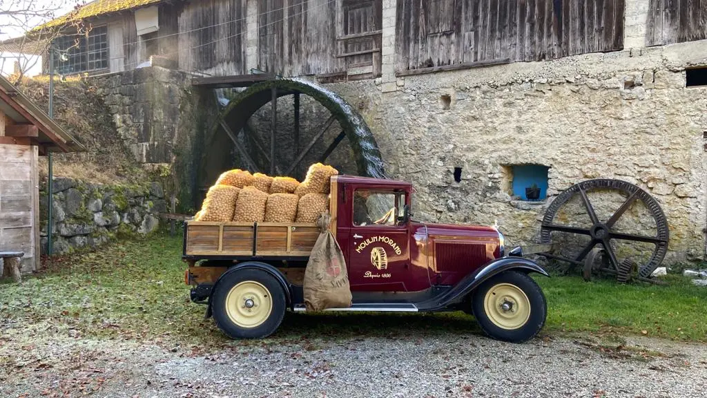Le moulin Morand (entretenu et exploité par Georges Morand, l’arrière-petit-fils du fondateur) fonctionne grâce à une roue hydraulique à auget entrainée par le nant de St François.