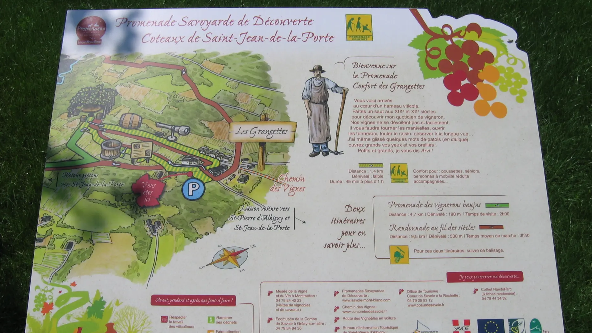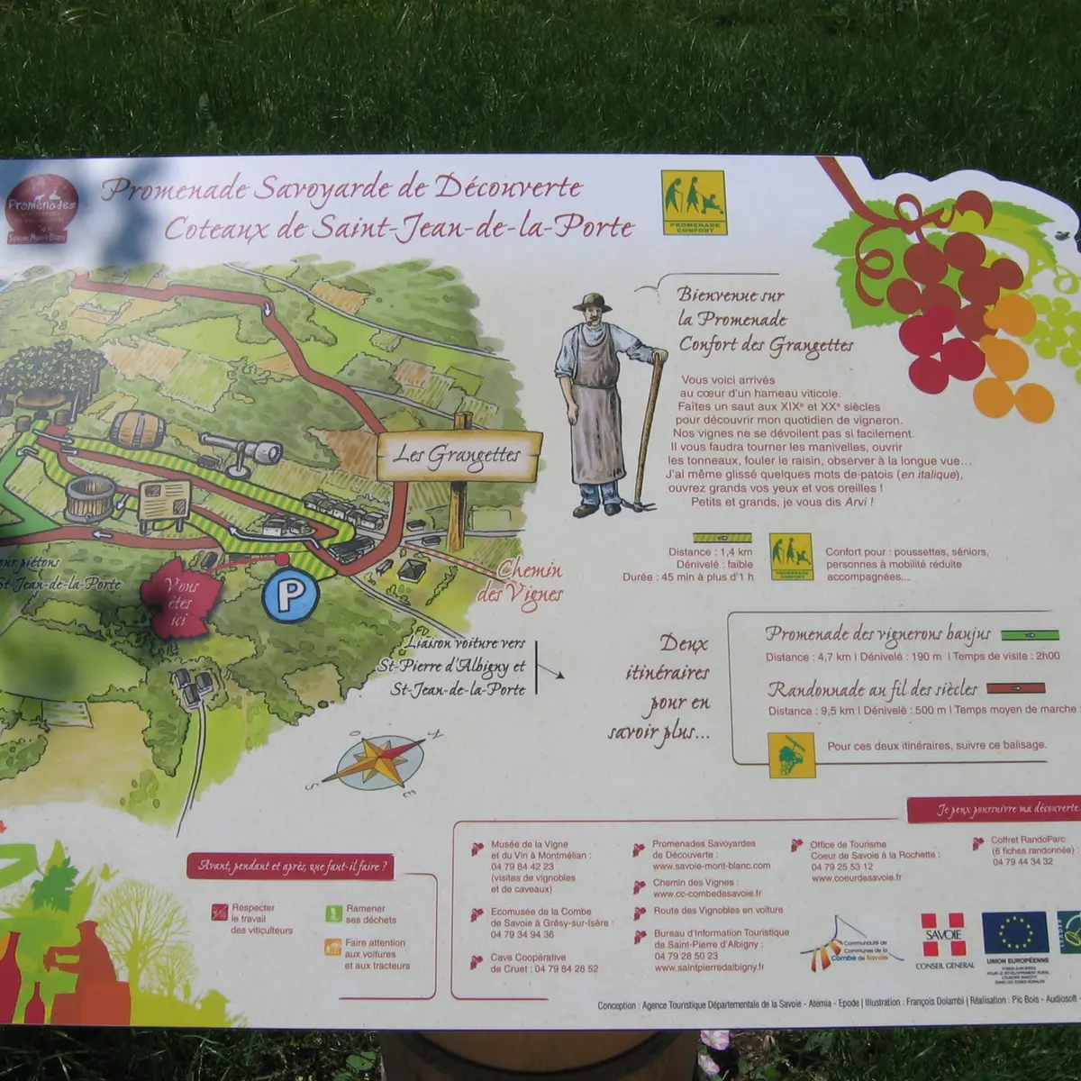 Le hameau des Grangettes baigne dans la vigne sur les coteaux ensoleillés du Massif des Bauges. De là une agréable promenade vous imprégnera de cette ambiance si spécifique aux vignobles Savoyards. Vous évoluerez face à la chaîne des Belledonnes et du Massif des Hurtières. Le paysage est grandiose et ouvert. A mi-parcours un kiosque belvédère vous proposera une halte culturelle sur la vigne et la montagne. Divers supports pédagogiques innovant vous offriront des découvertes inédites. Une offre inédite, liée à la Promenade Savoyarde de découverte du site.