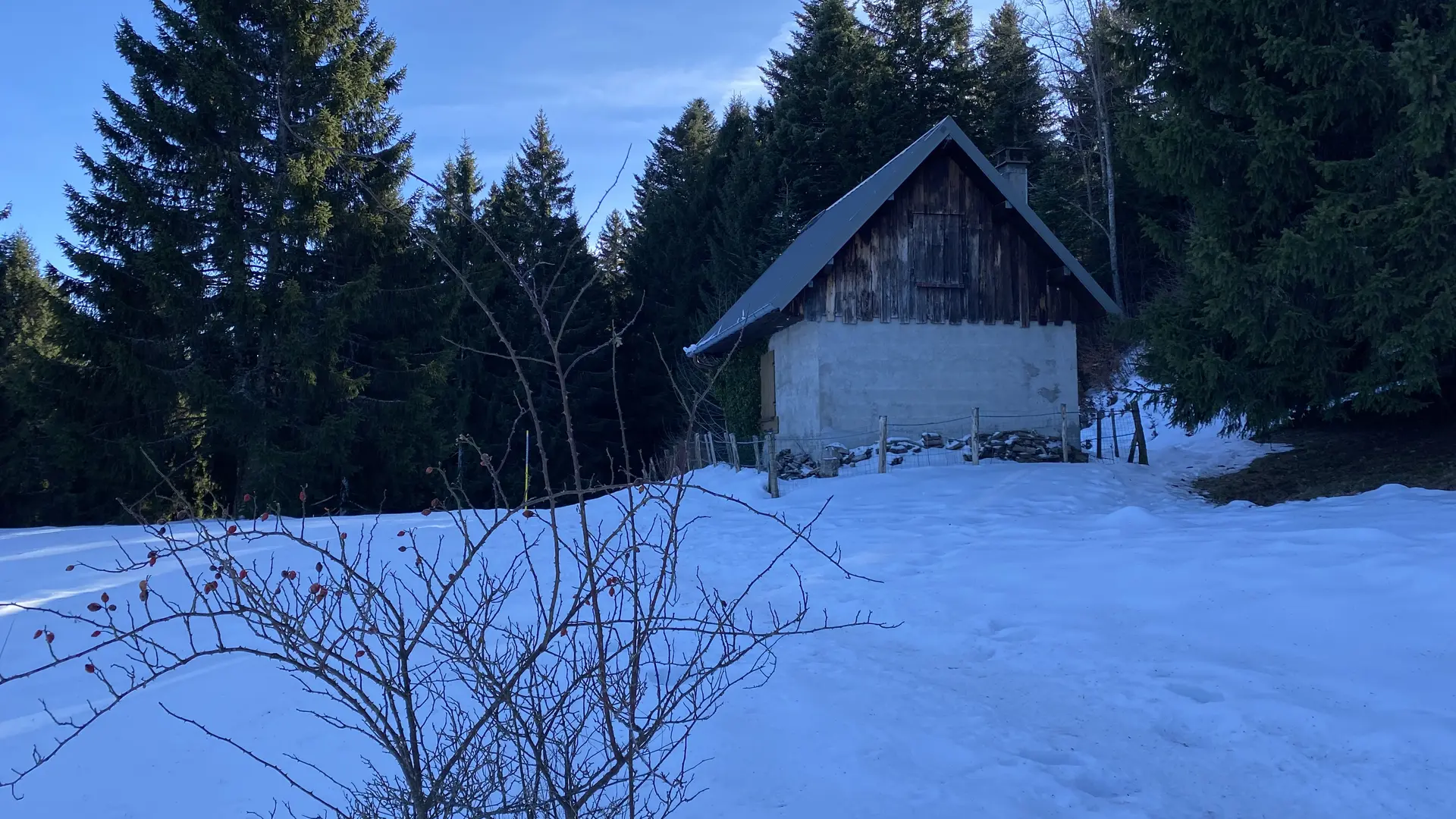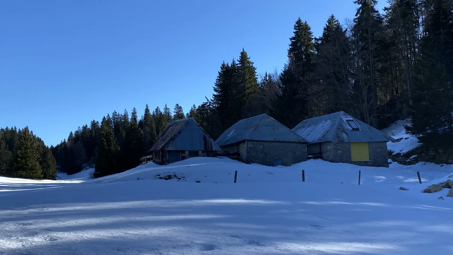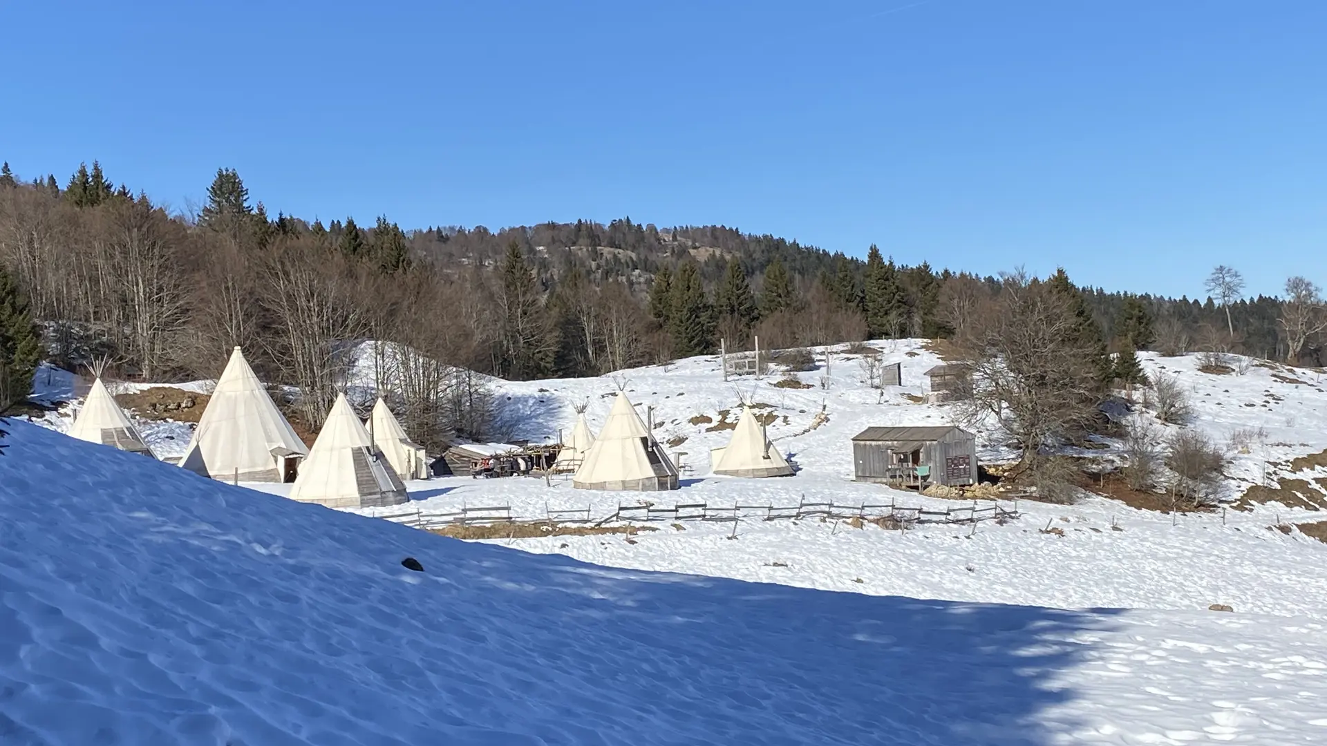 Le parcours commence par une courte descente qui longe la route départementale. Arrivés à hauteur du parking du Village Tipi, délaisser les pistes qui descendent directement aux tipis, et continuer jusqu’au totem directionnel « le Sierroz » à l’altitude 1342 m. Prenez la direction « Croix des bergers ». Vous arrivez ensuite dans l’alpage à proximité du village tipi. L’itinéraire est bien balisé avec des piquets jaunes et/ou des logos « raquettes » jusqu’aux fermes de Peisse Bernard (environ 1,45 km parcourus).