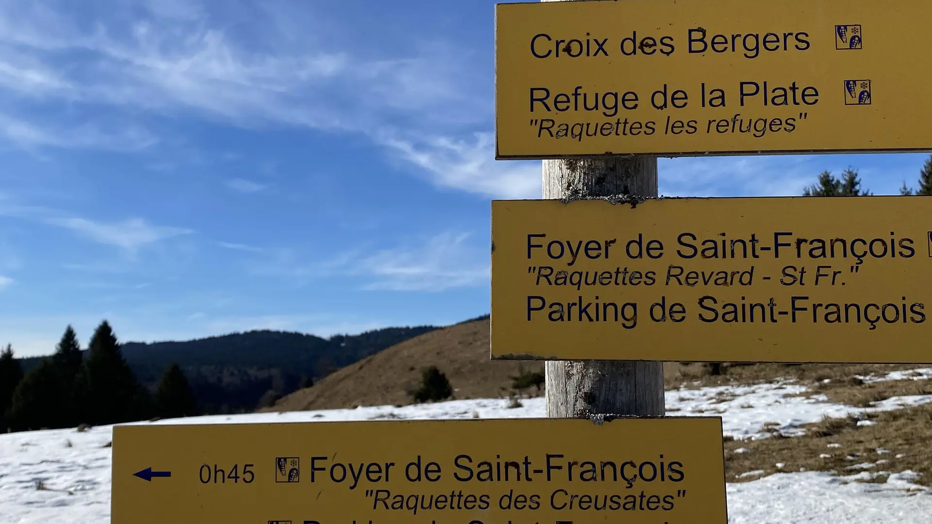Stationner sur le parking du foyer nordique de Revard Crolles. Trouver le drapeau « départ sentier raquettes ».