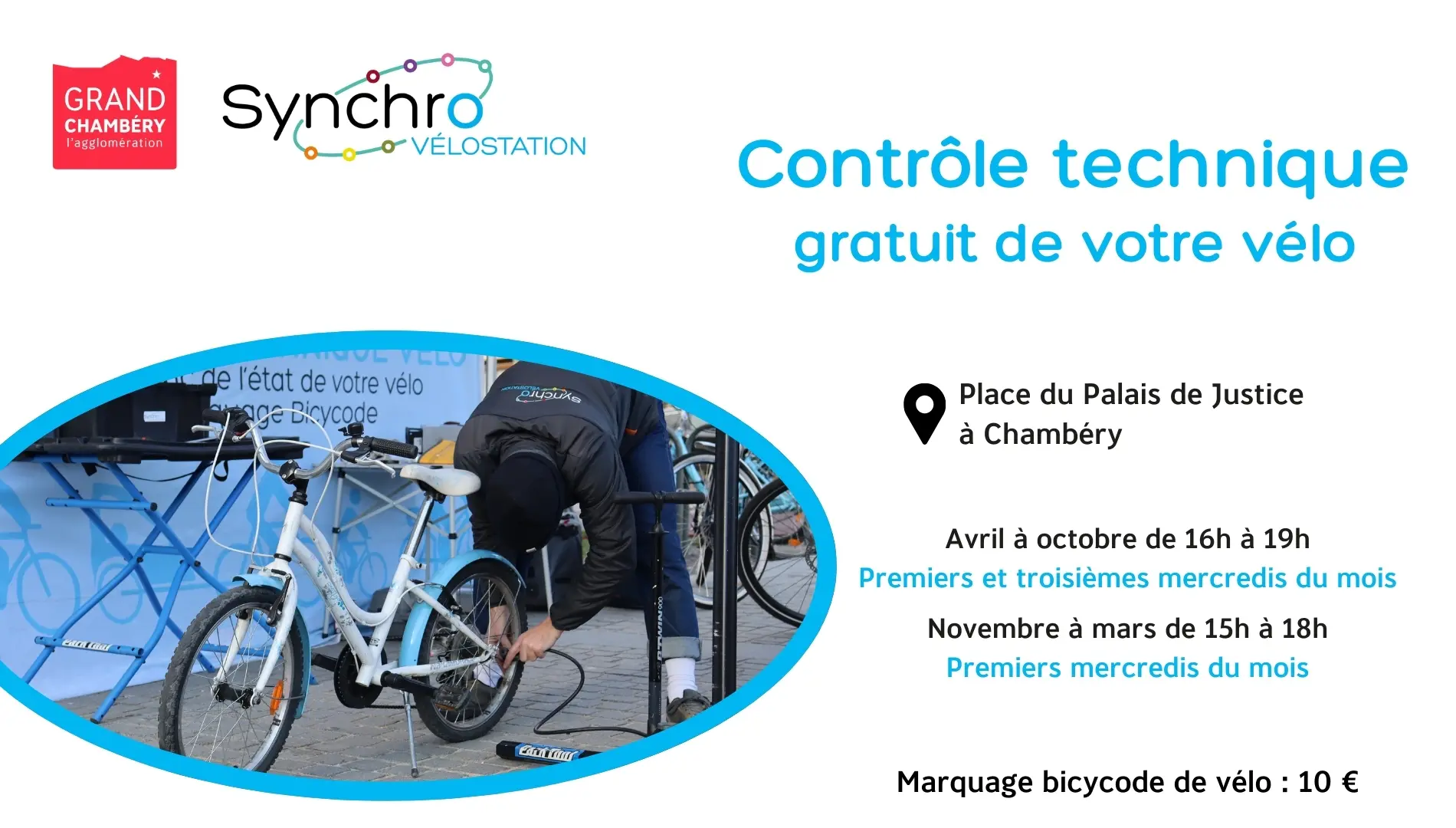 Offrez un check-up à votre vélo ! Synchro Vélostation, la Vélostation de Chambéry, réalise gratuitement le contrôle technique de votre vélo, 1 à deux mercredis par mois sur la place du Palais de Justice.