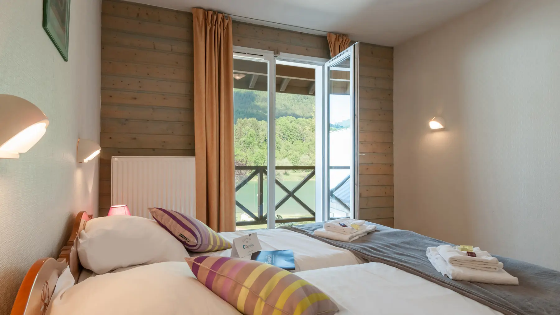 En été, profitez de la terrasse avec vue sur lac et montagnes, et de la base de loisirs sur place : tennis, espace aqua ludique, wakeboard, water games, ...