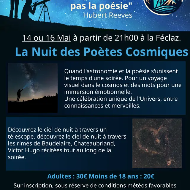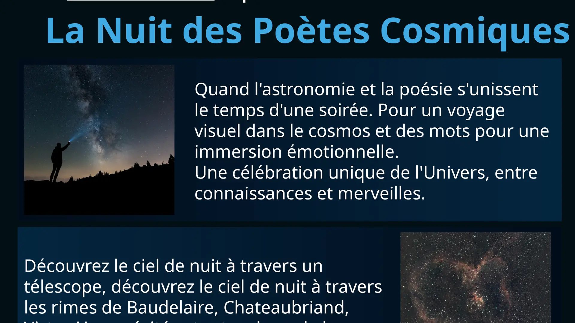 Quand l'astronomie et la poésie s'unissent le temps d'une soirée. Pour un voyage visuel dans le cosmos et des mots pour une immersion émotionnelle.