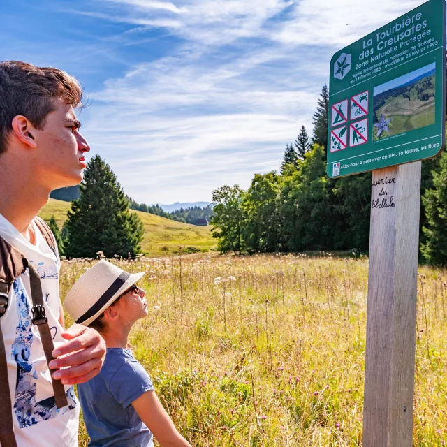 Véritable archive climatique, la tourbe conserve les pollens et éléments végétaux enfouis depuis la fin de la dernière glaciation, retraçant 12 000 ans d’évolution du climat et des paysages. Classée Natura 2000 et protégée par un arrêté préfectoral de biotope depuis 1985, la tourbière se visite grâce à un sentier d’interprétation sécurisé, ponctué de passerelles, belvédère pédagogique et panneaux explicatifs, qui permettent une découverte douce, sans piétinement, de cet écosystème sensible.